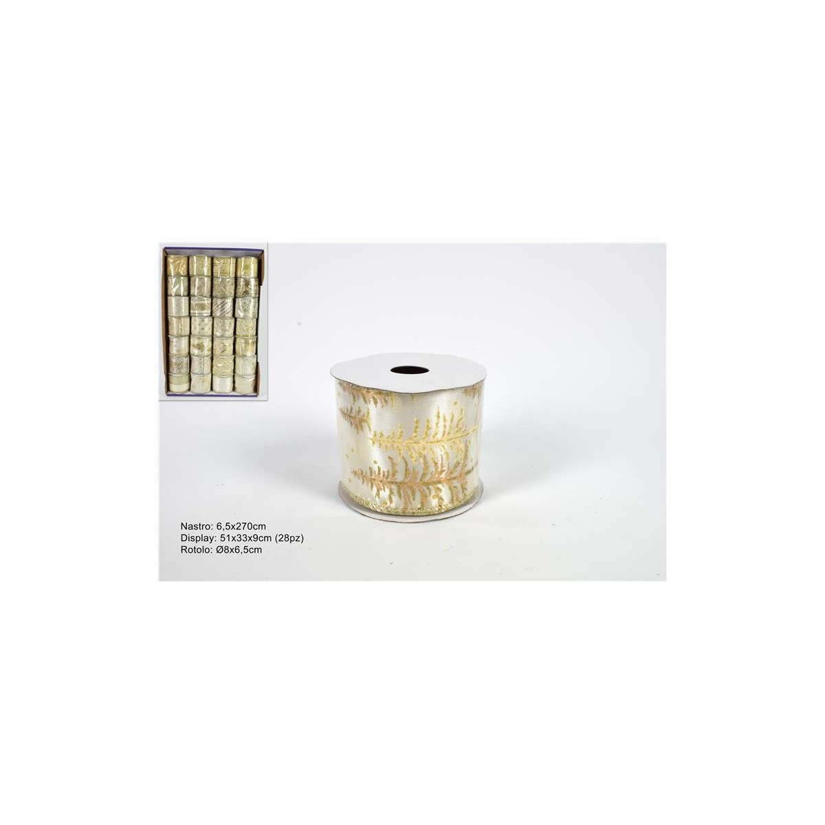 Nastro in tessuto bianco con fantasie assortite. Misure: 6,5 x 270 cm. Confezione singola.