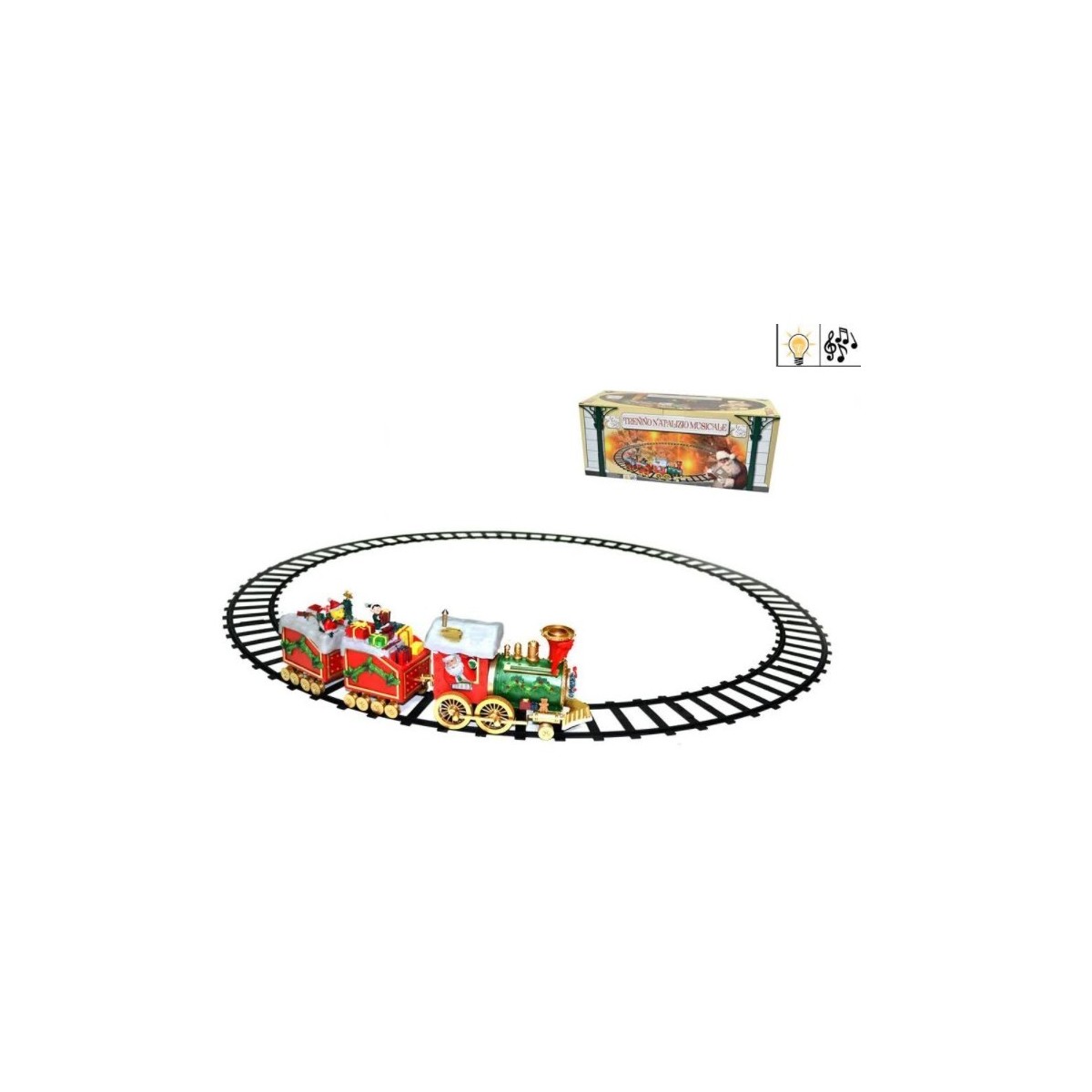 Un suggestivo trenino natalizio di babbo natale con luci e suoni per decorare la base del tuo albero. Perfettamente curato nei minimi particolari. Uno stile che ricorda i tempi antichi, renderà i bimbi contentissimi di aspettare il Natale. Funziona a batteria con 4 pile AA (batterie non incluse).