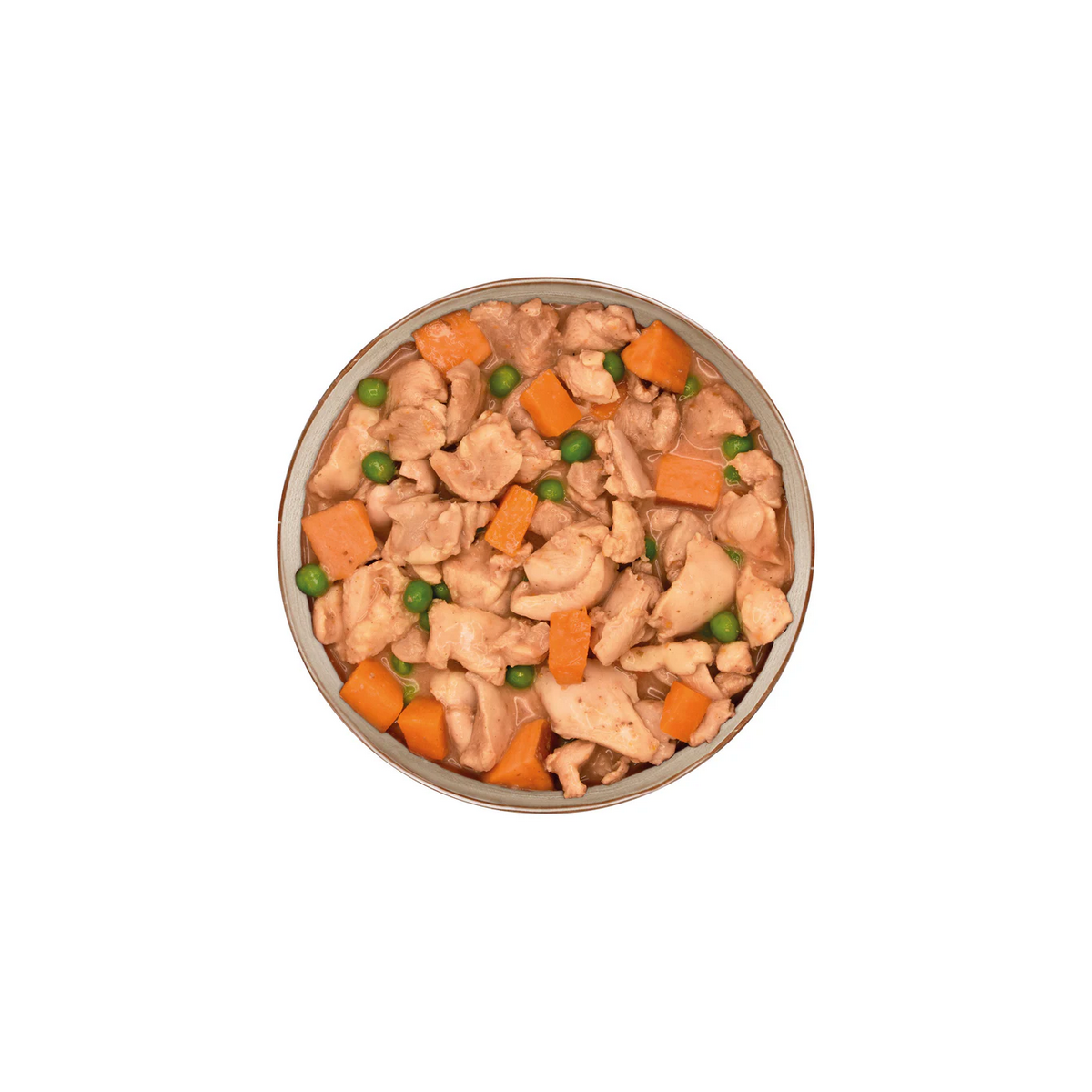 Composizione: 97% pollo fresco in salsa, patata dolce, piselli, carota, spezie.