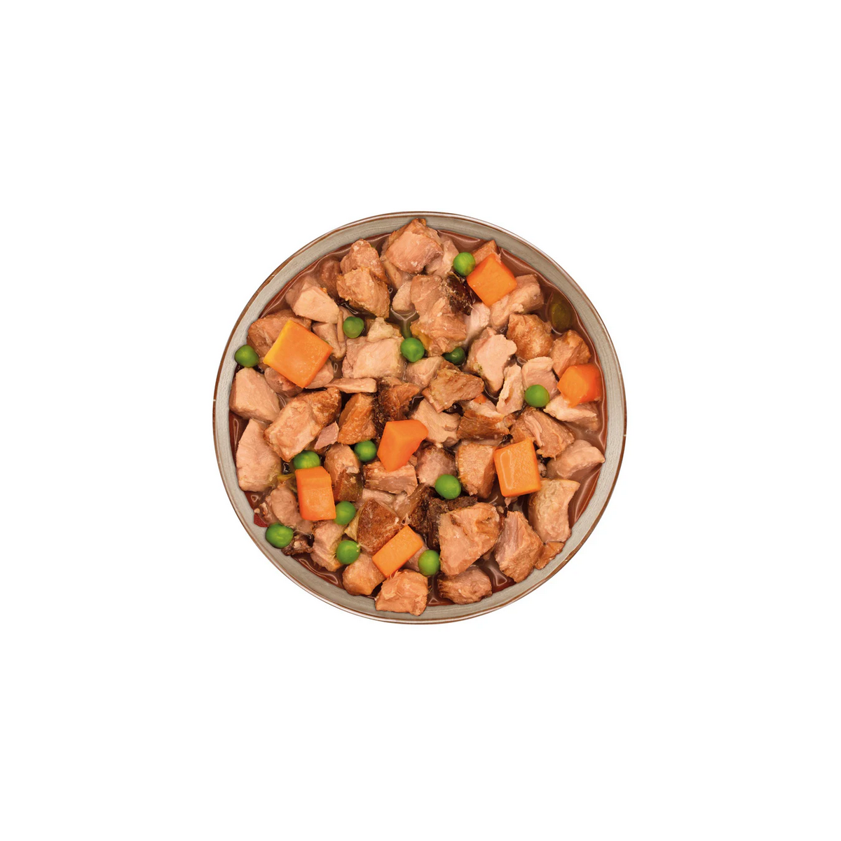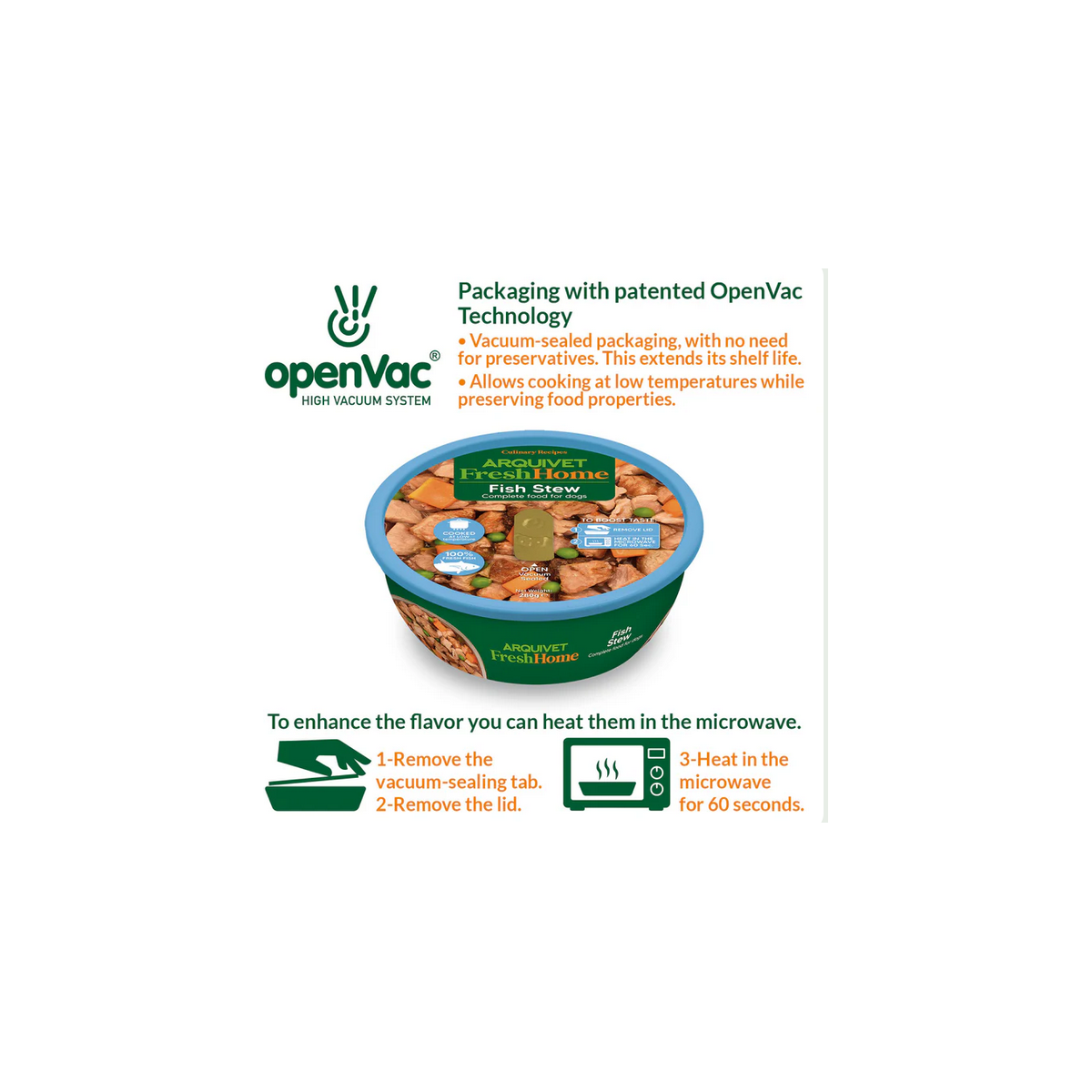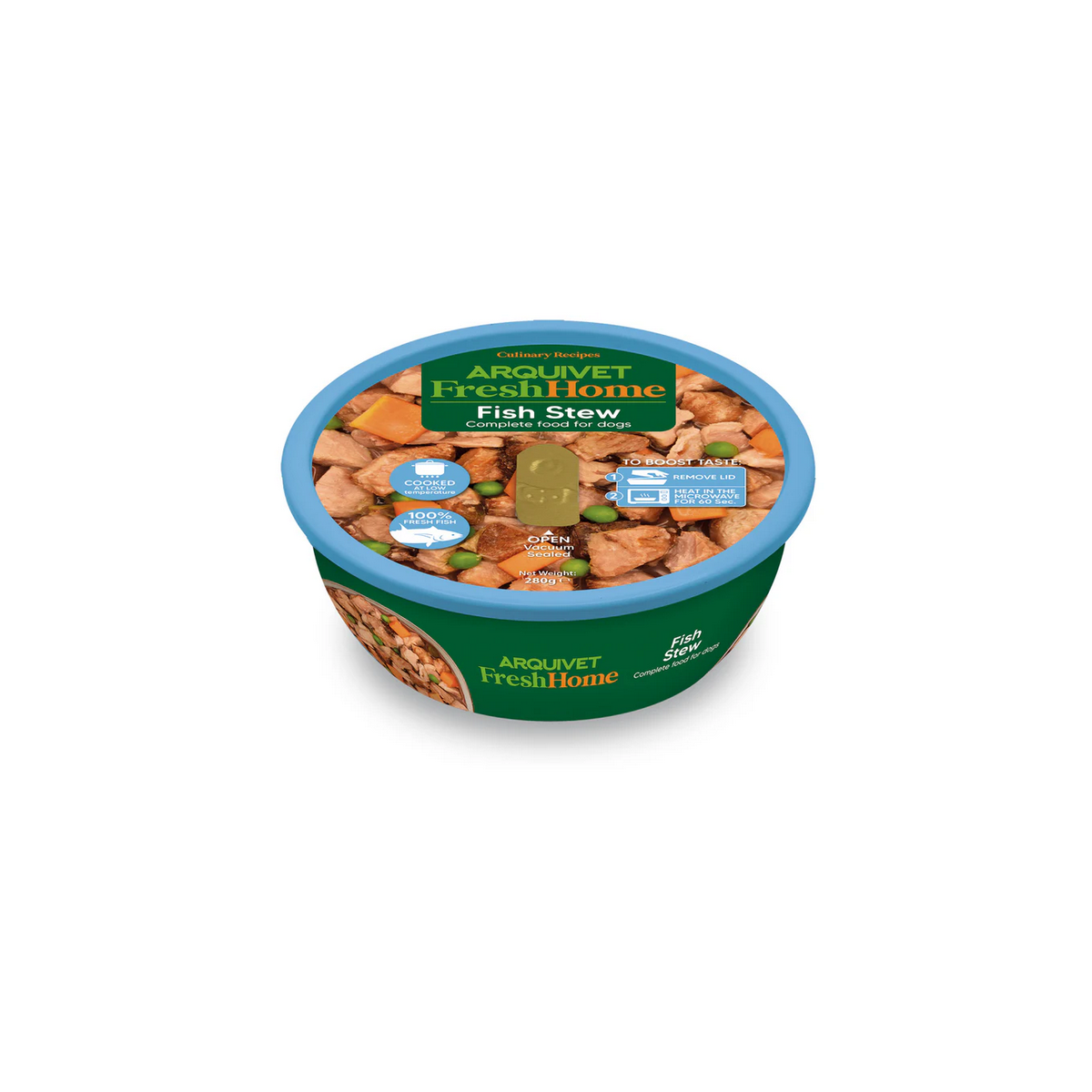 Stufato di pesce. Alimento completo umido per cani. Ricetta casalinga, cotta a fuoco lento come a casa, 100% naturale ed equilibrata. Ideale per cani di tutte le età, compresi quelli con stomaco sensibile o allergie alimentari. Può essere servito come pasto unico o utilizzato come delizioso "topping" per aggiungere sapore e aroma al cibo secco.