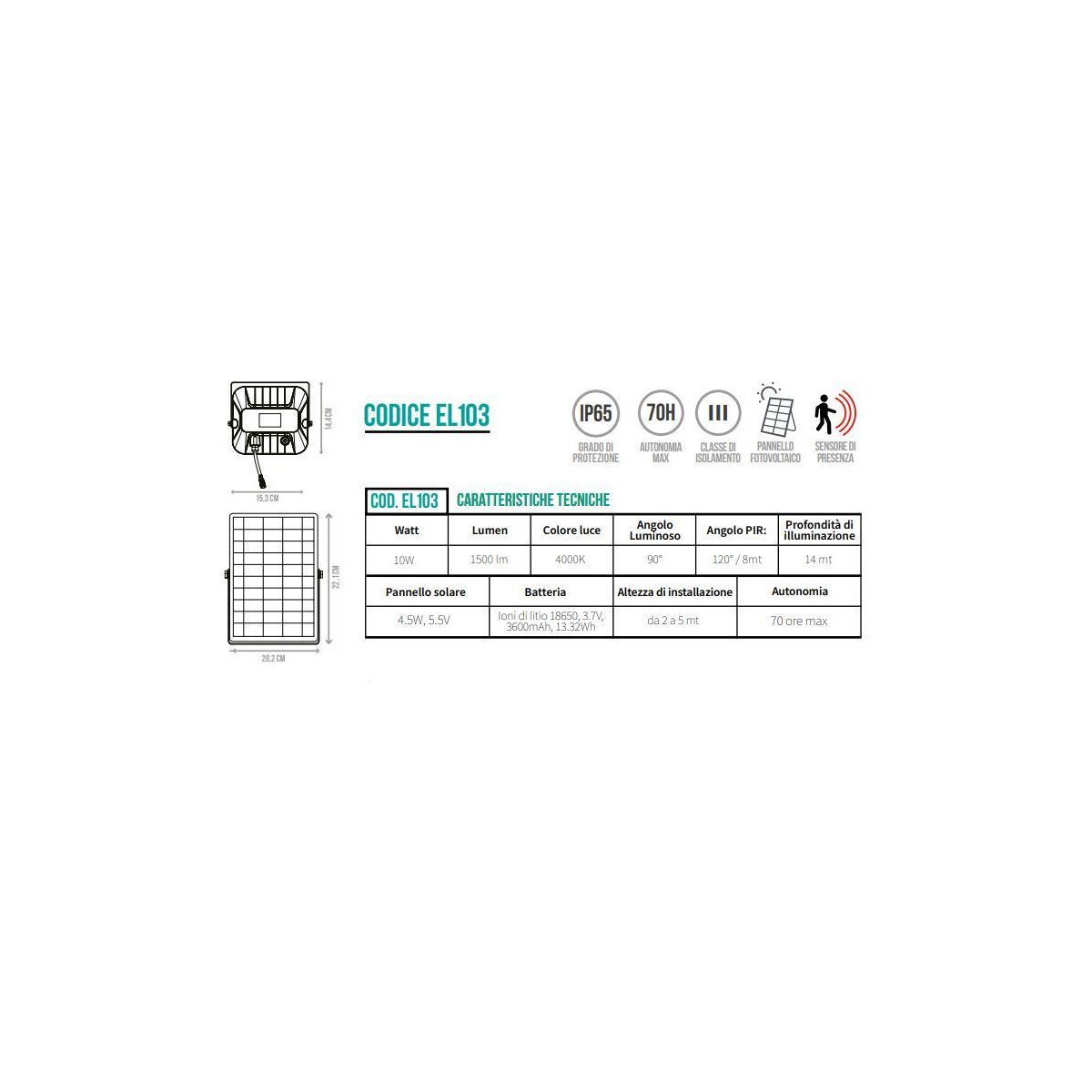 Modalità di funzonamento continua o automatica. Al passaggio l'intensità luminosa aumenta in modo rapido e progressivo fino alla massima intensità. 10W 1500 lumen, installabile fino a 5 metri da terra. Grado di protezione IP65, autonomia 70 ore, , raggio di illuminazione 120°. Tempo di ricarica con luce diretta 6 ore. Batteria sostituibile. Dimensioni lampada 15,3X14,4 cm. dimensioni pannello 20,2X22,1 cm. Telecomando incluso per impostare l'internsità e i tempi di illuminazione. Lunghezza cavo 5 mt.
