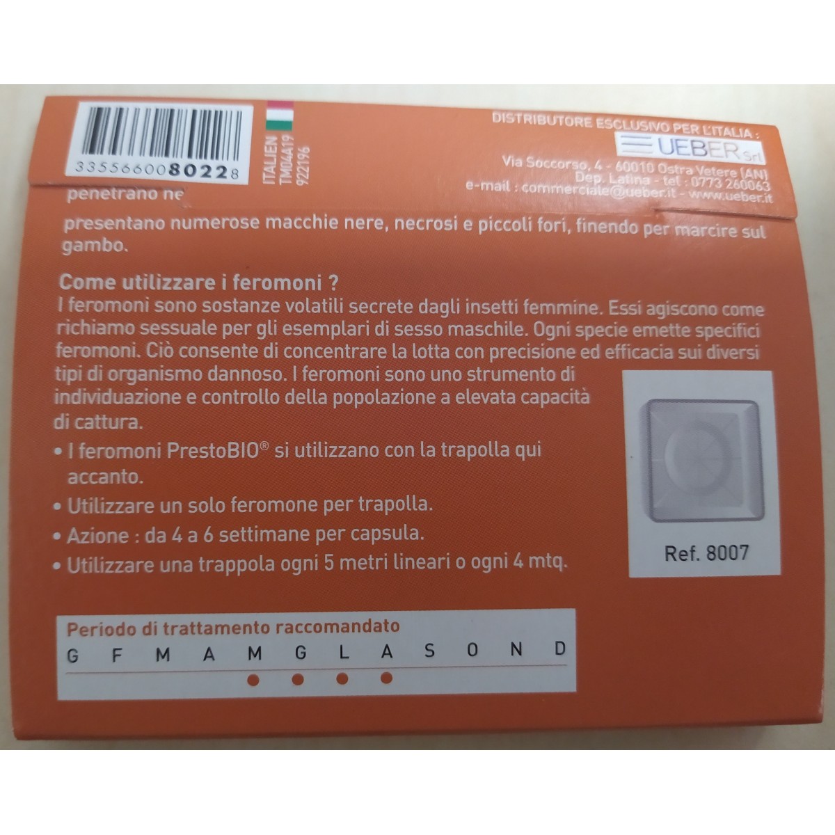 I feromoni si utilizzano con una trappola. Utilizzare un solo feromone per trappola, metterlo nel piccolo contenitore porta capsula della trappola a feromoni.