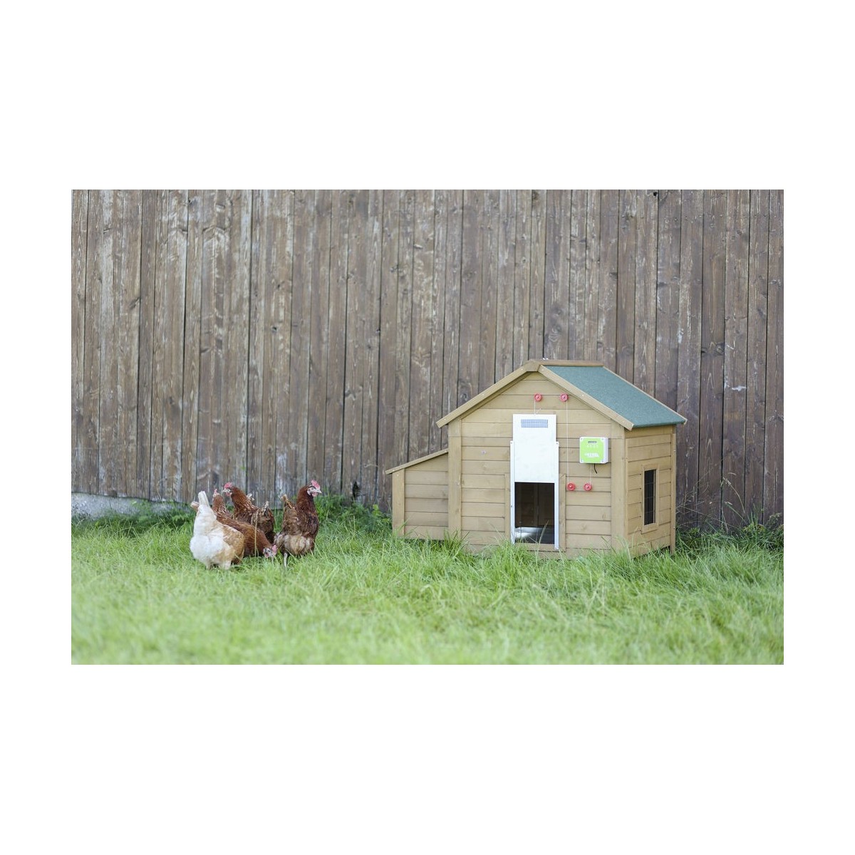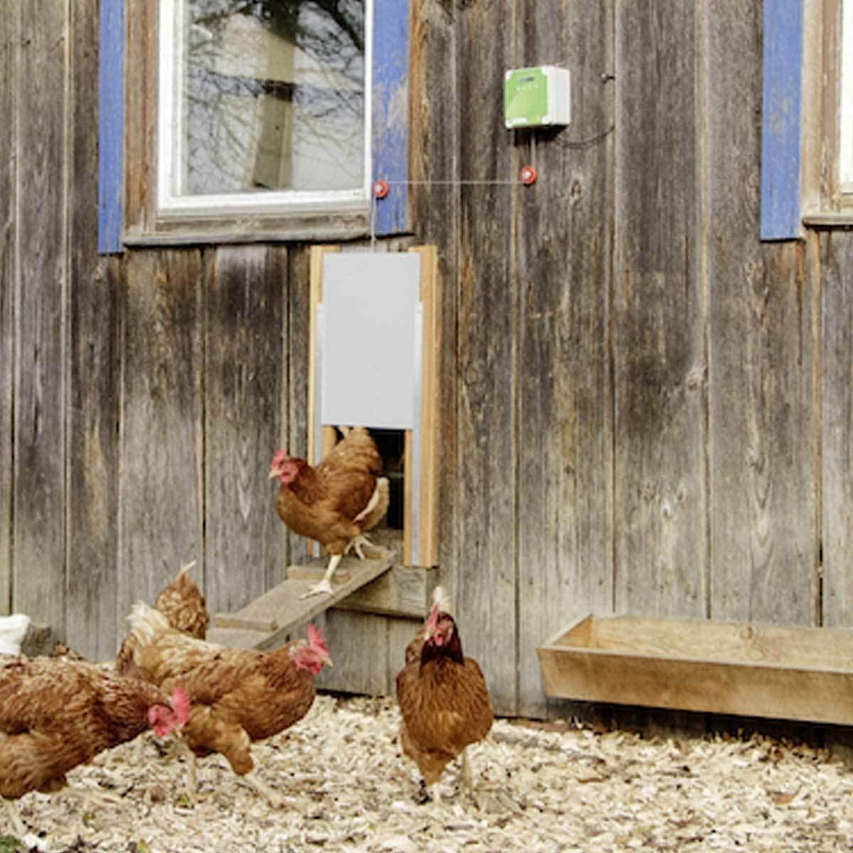 La porta per polli automatica è dotata di dispositivi di sicurezza. Un ritardo sul segnale luminoso impedisce l'apertura indesiderata in caso di fulmini o luminosità a breve termine. Se il cursore incontra resistenza da parte di un animale durante la chiusura, il processo viene interrotto e ripreso solo quando l'animale è stato rimosso.