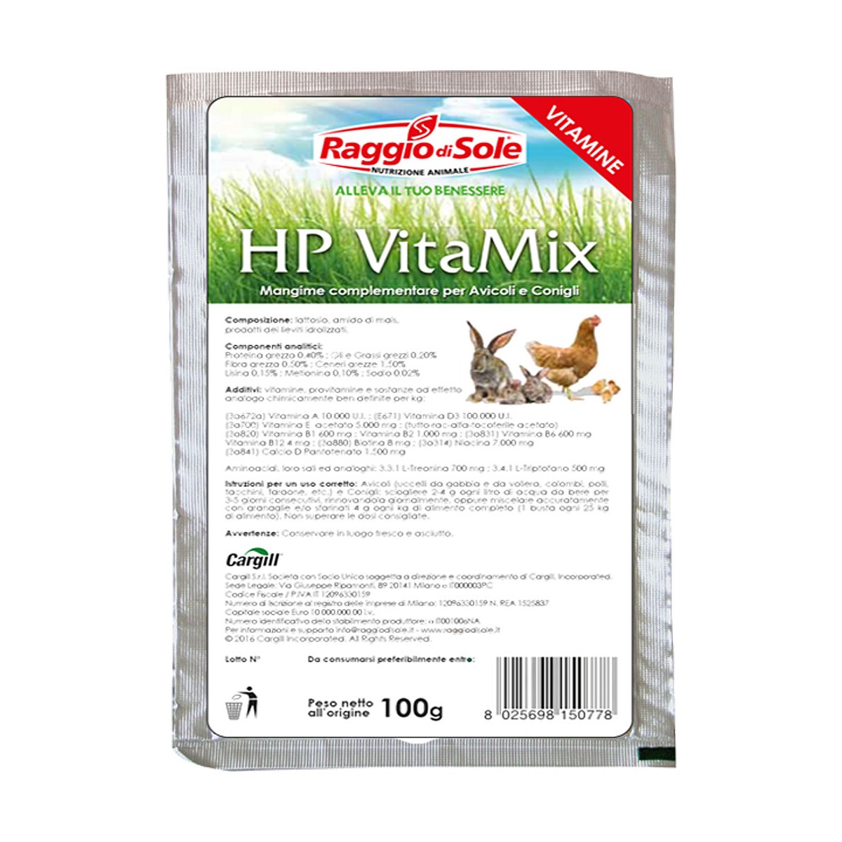 HP VitaMix è un integratore alimentare per uso animale della linea HP Help di Raggio di Sole che unisce vitamine ed aminoacidi per garantire il corretto sviluppo ed elevate produttività, contrastando gli effetti negativi dello stress. Integratore polivitaminico con aminoacidi in polvere, è solubile e può essere utilizzato disciolto in acqua o aggiunto come integrazione nel mangime.