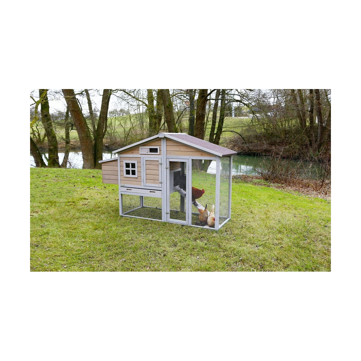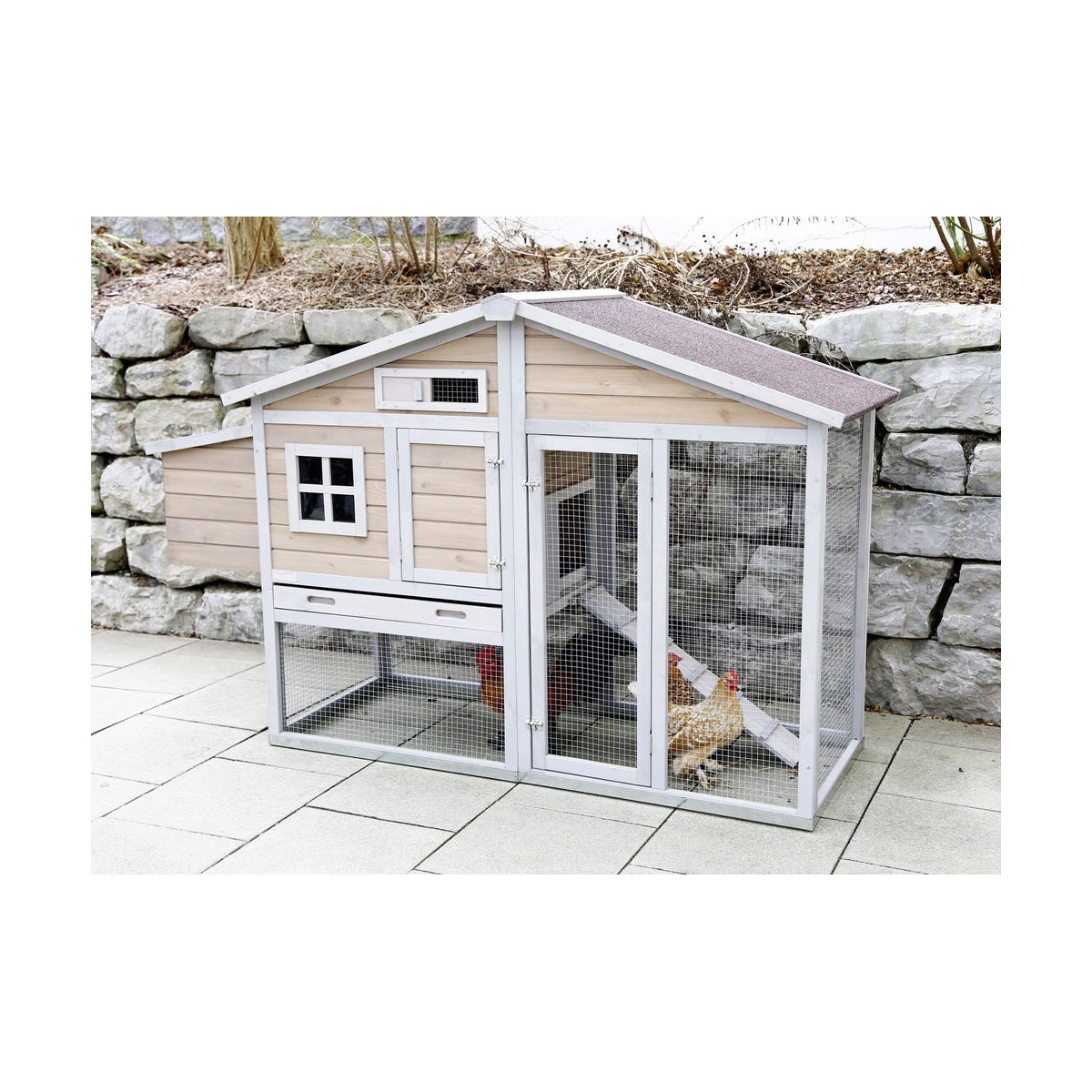 Realizzato in abete cinese di alta qualità, con finestra scorrevole per una circolazione dell'aria variabile, telaio metallico a terra protegge dall'umidità e dal deterioramento del legno, maggiore sicurezza grazie a una serratura aggiuntiva per porta, l'accesso tra il recinto esterno e l'area di riposo può essere bloccato. Smaltato con colore legno protettivo con tetto in bitume resistente alle intemperie.