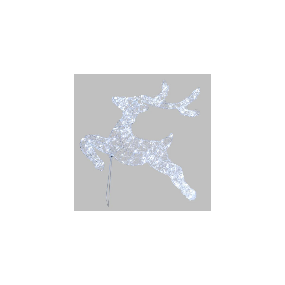 Renna Galoppante da esterno costruita su un telaio metallico verniciato di bianco e decorata con una rete di acrilico morbido ed illuminata da luci led a goccia che irradiano la luce a 360° a luce fissa.