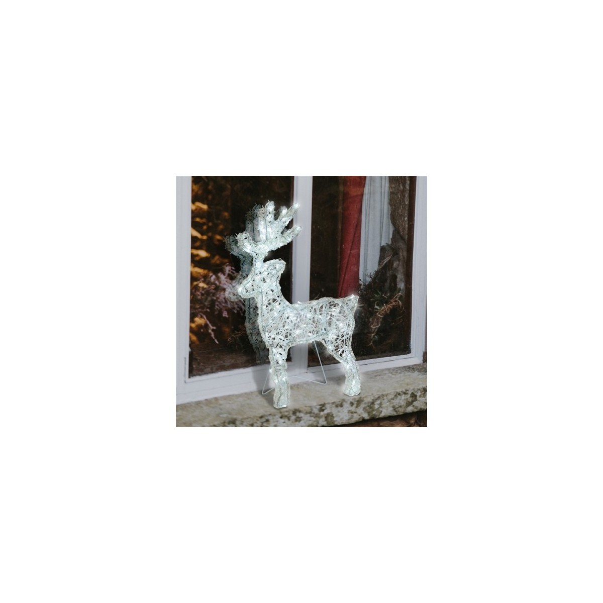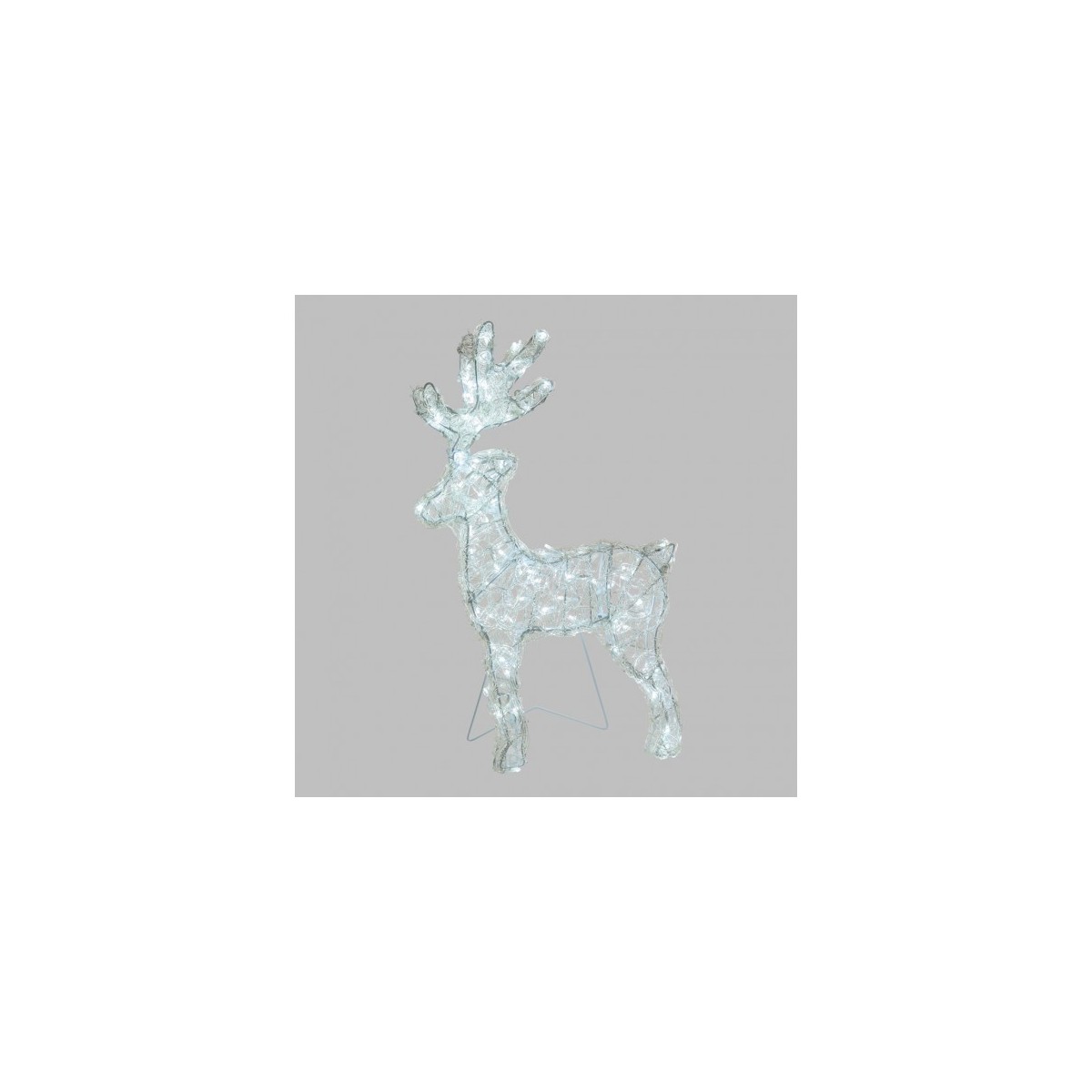 Renna Thin 3D luminosa con 120 led bianco freddo, altezza 60cm in acrilico Soft. Piedistallo ripiegabile e telaio in metallo verniciato bianco, può essere appesa o installata a terra, luce fissa, con trasformatore di sicurezza 31V. Per uso Esterno e Interno, grado di protezione IP44, cavo alimentazione trasparente lungo 4 metri. Dimensioni: 36x5xH60cm.