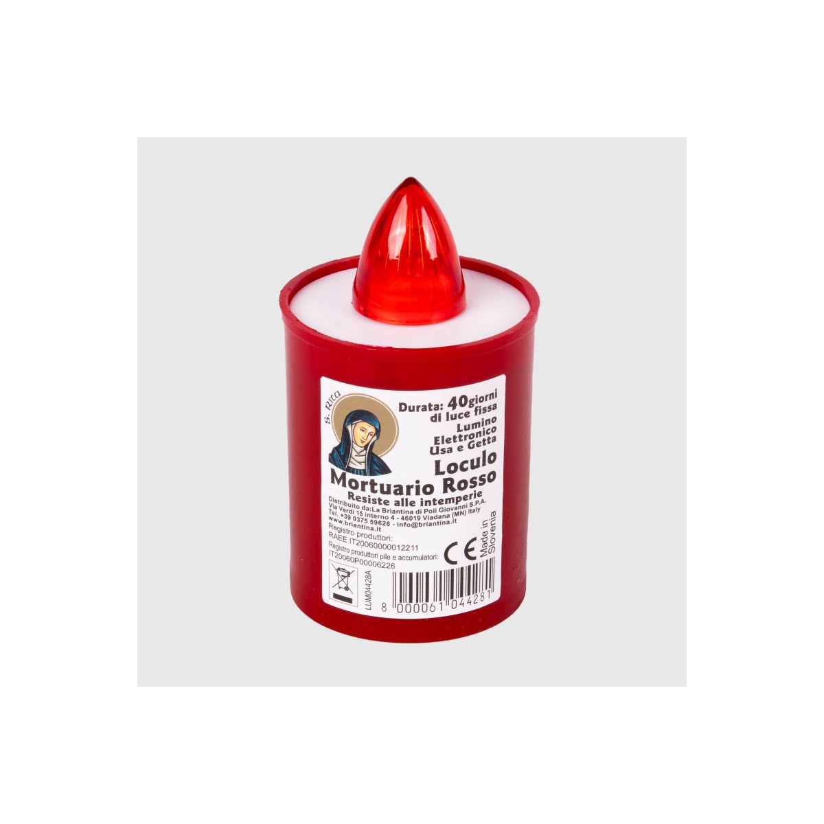 Lumino elettrico di colore rosso per loculo mortuario, luce rossa fissa. Lumino per interno ed esterno. Con pulsante ON/OFF.Durata: 40 giorni.Dimensione: h. 9 cm - Ø 5 cm.Batterie incluse.