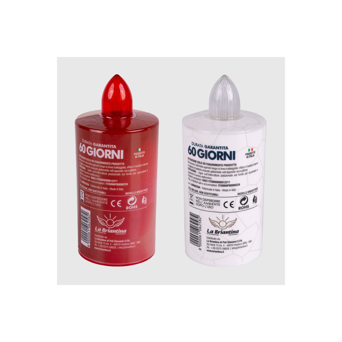Durata: 60 giorni. Dimensione: h. 14 cm - diametro 6 cm Batterie incluse. Disponibile in bianco e in rosso. Prodotto fabbricato in Italia.