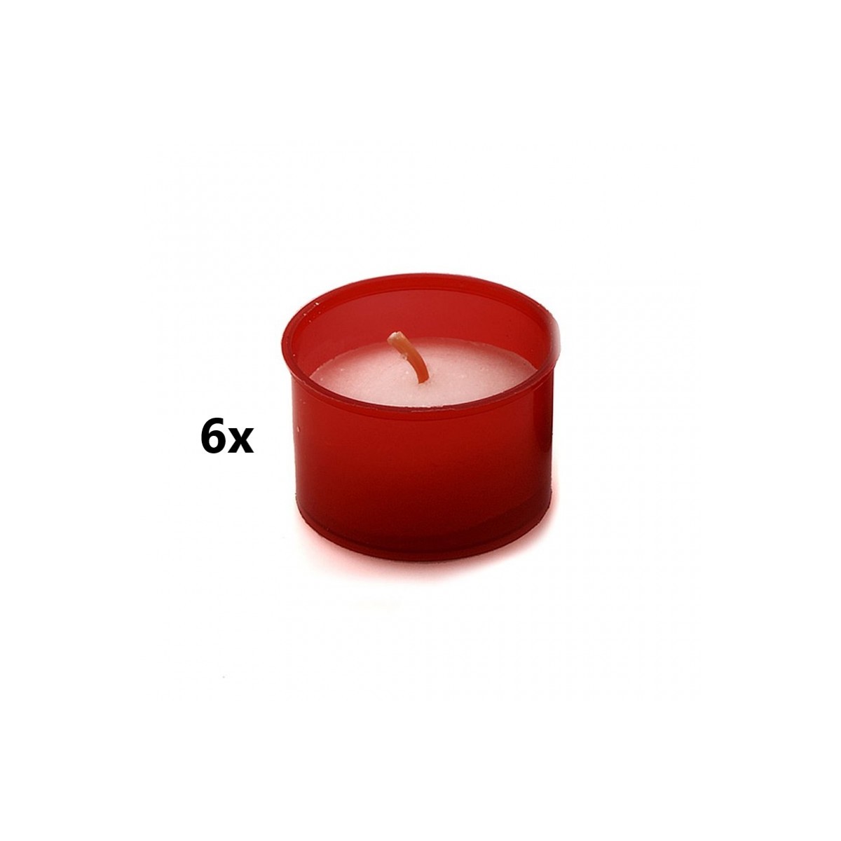 Lumini di paraffina vasetto in plastica rosso, cera bianca. Stoppino in cotone cerato. Prodotto fabbricato in Italia. Dimensioni: Ø 5.2 cm - h. 6 cm Pack: 6 pz Durata: 20 ore