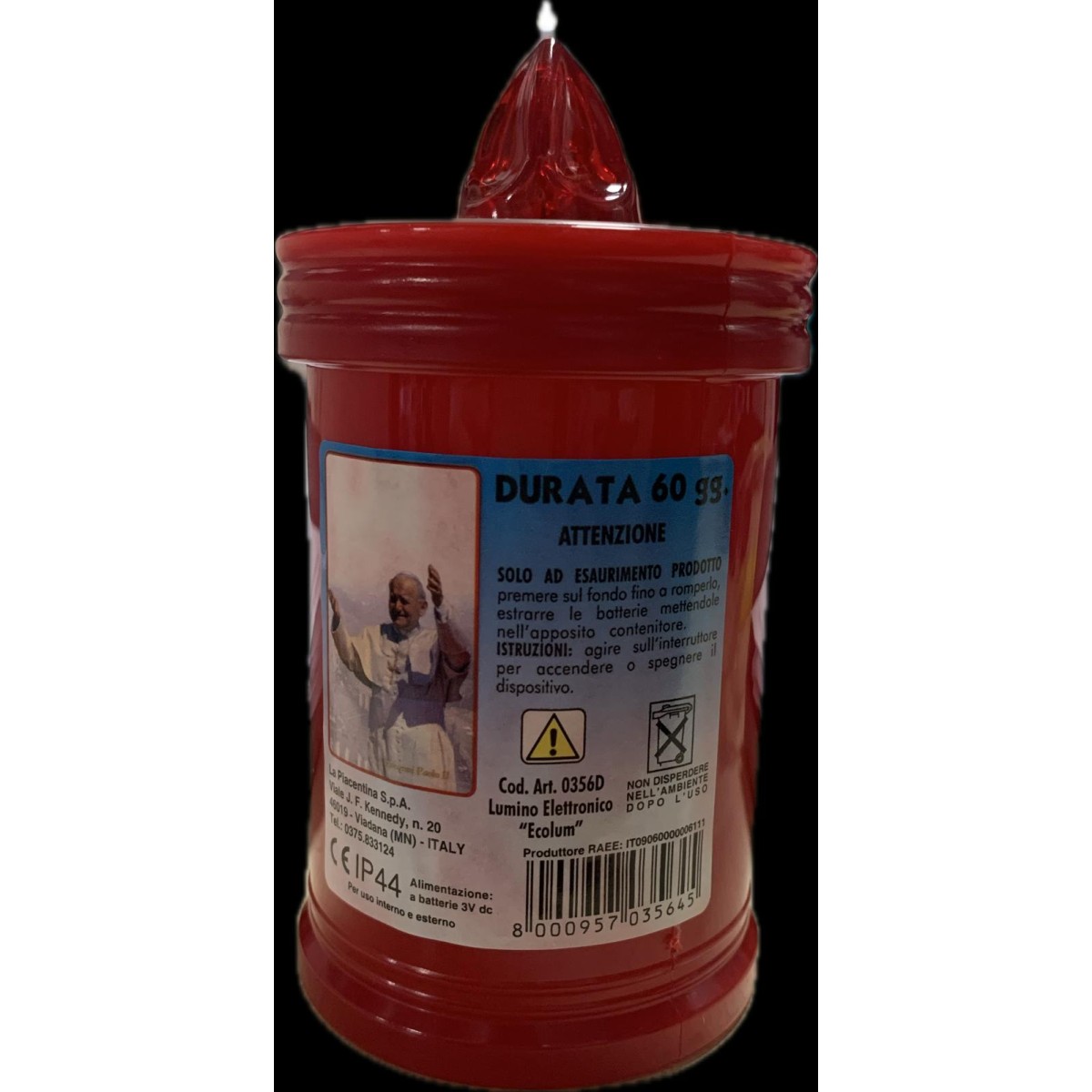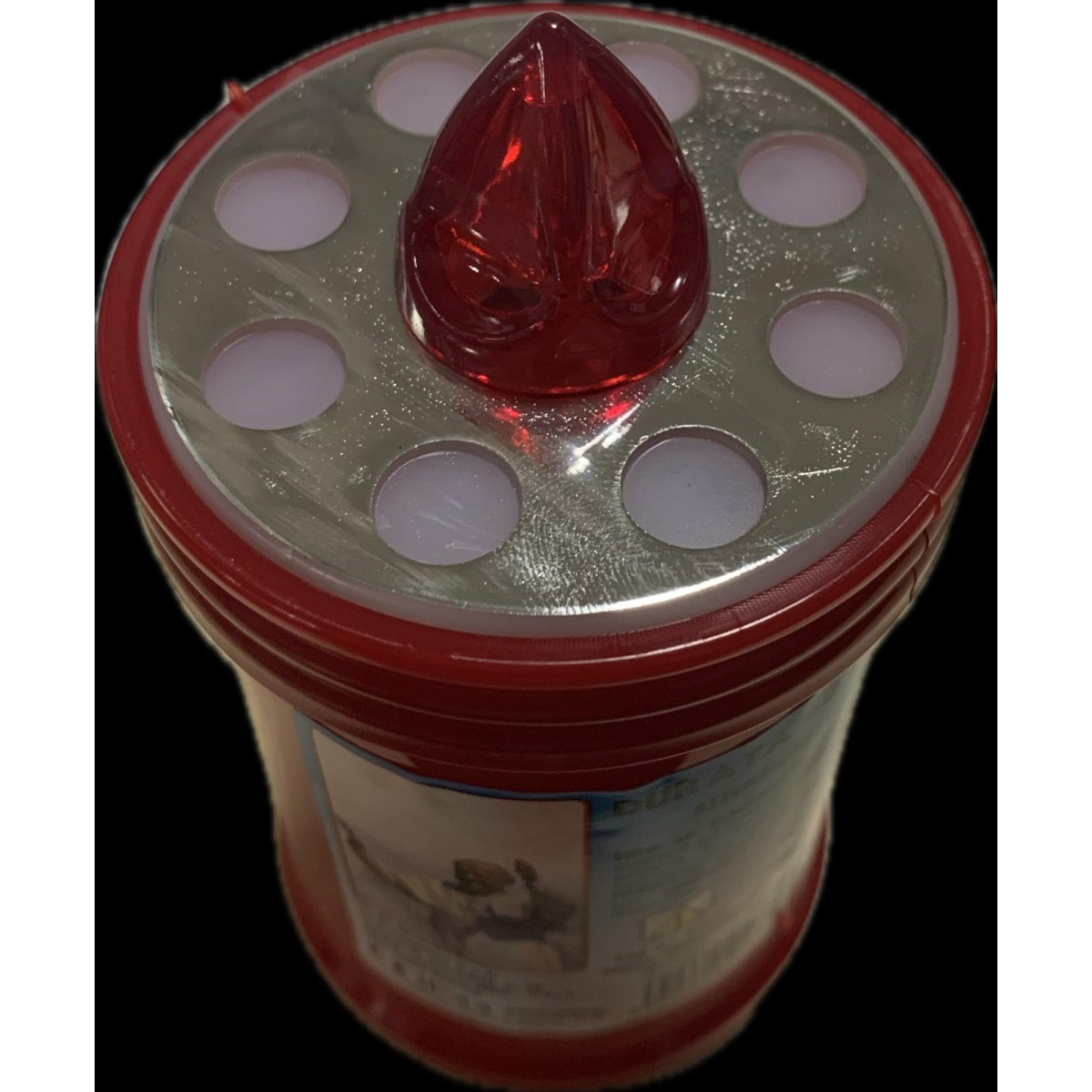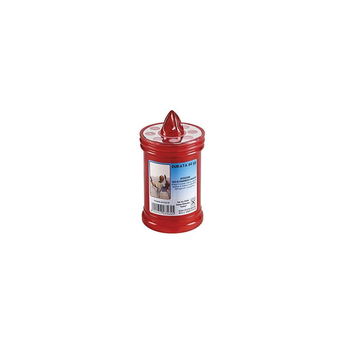 Lumino elettrico usa e getta, di colore rosso per loculo mortuario, luce rossa fissa. Lumino per interno ed esterno. Durata: 60 giorni Dimensione: h. 10,5 cm - Ø 6,5 cm Batterie incluse.