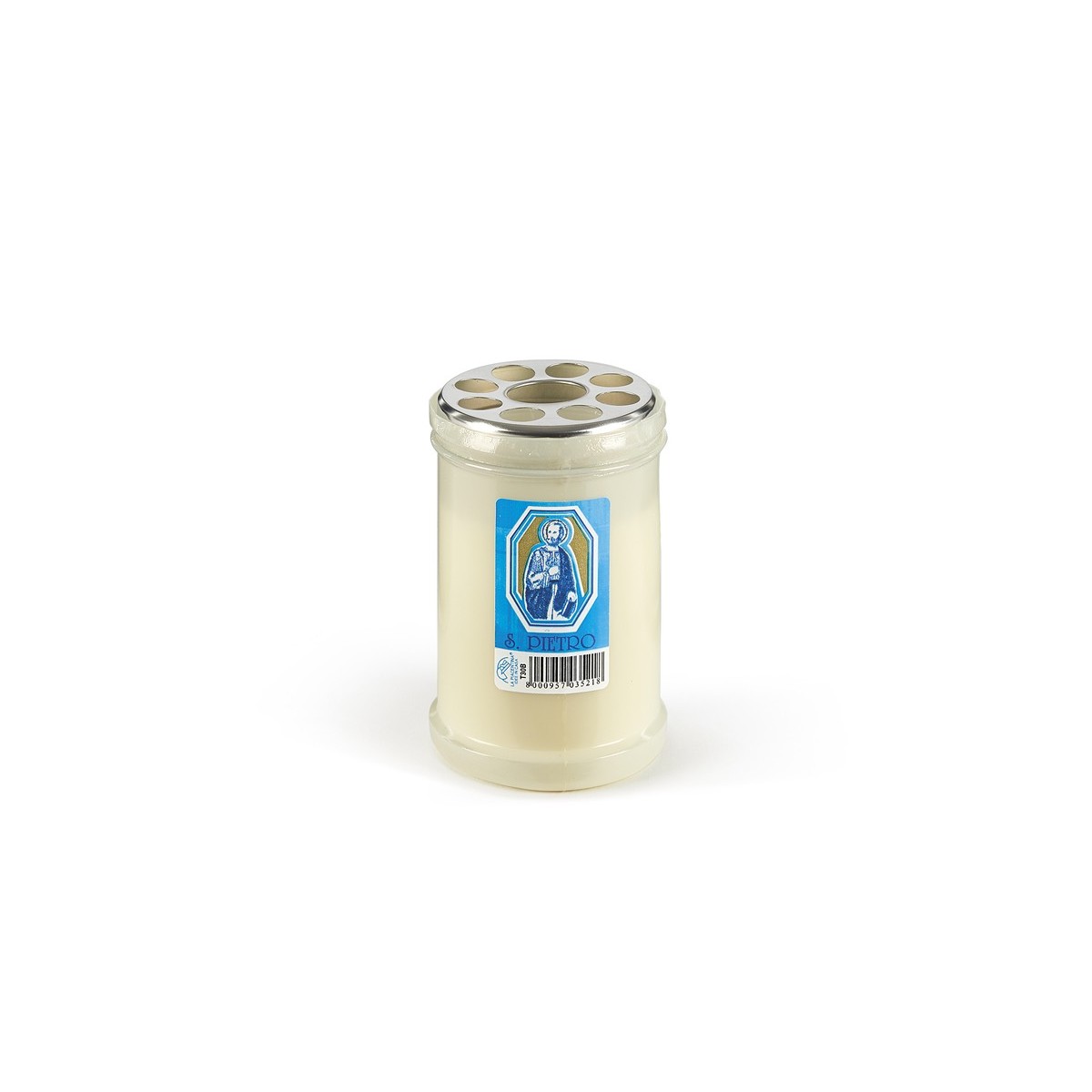 Cero votivo bianco T30, h 10 cm diametro 6 cm. Contenitore in PVC e metallo, corpo in paraffina e stoppino in cotone.