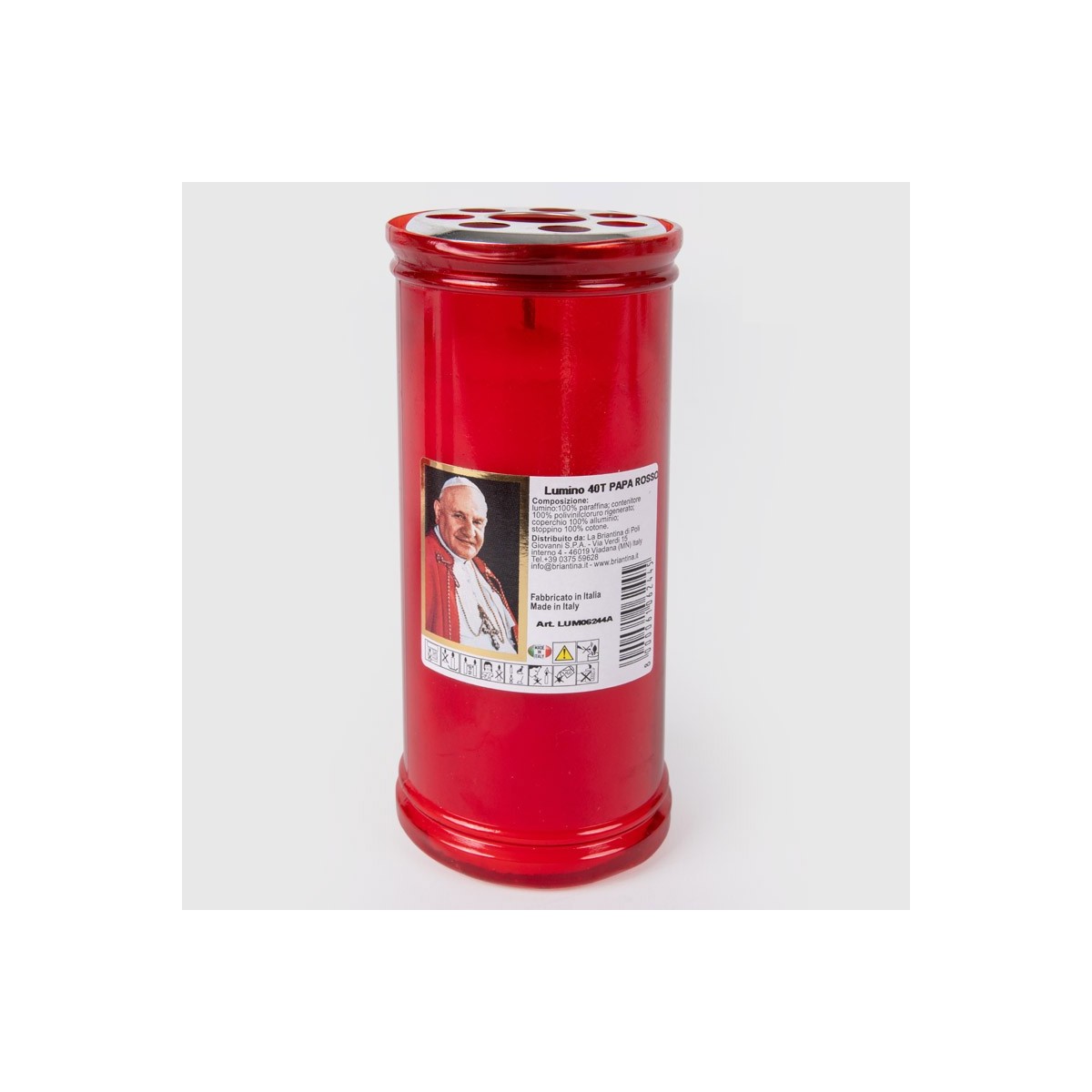 Lumino 40T di paraffina a pasta bianca e stoppino in cotone cerato. Soggetto Papa Giovanni XXIII. Porta lume rosso in PVC rigenerato dotato di griglia metallica argentata.