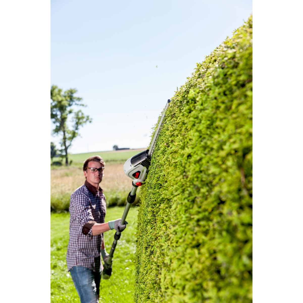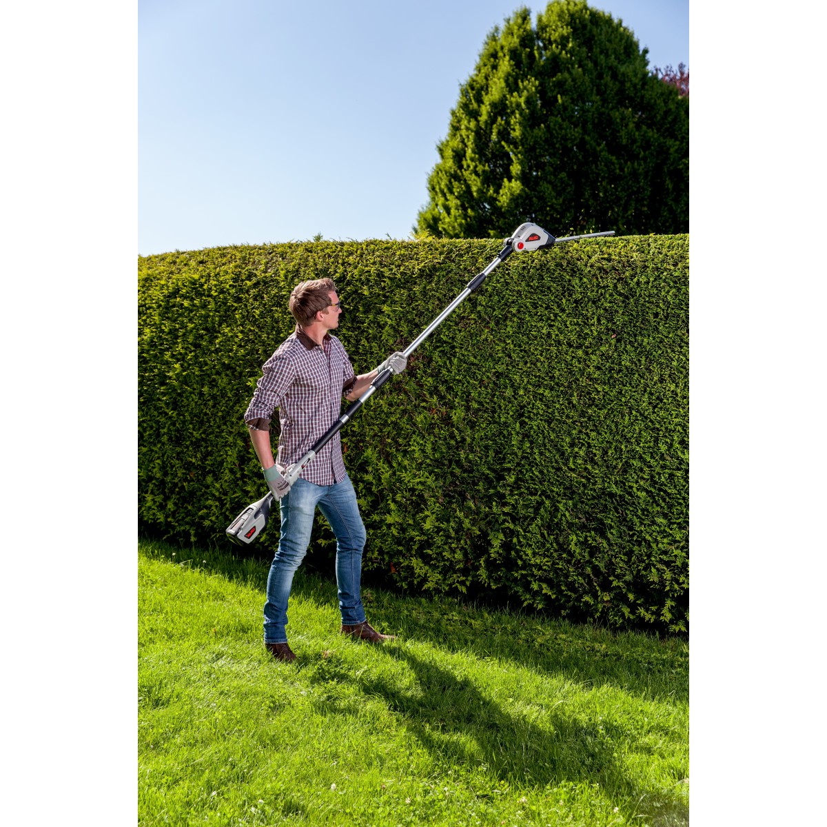 Accessorio Tagliasiepi da collegare all'unità base del Multitool AL-KO MT 40 Li. Dotato di tubo prolunga per poter raggiungere siepi ancora più in alto (fino a 3,5 metri). La sua leggerezza e tracolla rendono il lavoro meno faticoso. Un aiuto al rispetto dell'ambiente con emissioni zero ed il vantaggio di non avere cavi di intralcio. La barra tosatrice può essere regolata in ben 7 posizioni.