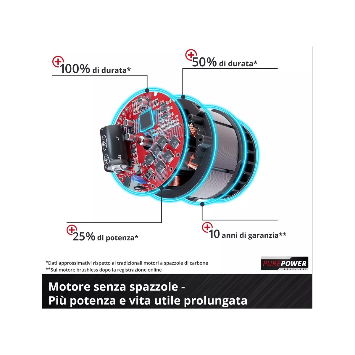 Il soffiatore per foglie a batteria GP-LB 18/200 Li E-Solo di Einhell è un affidabile aiutante, soprattutto per le pulizie primaverili e autunnali. Essendo un componente della famiglia Power X-Change, tutte le batterie di questa serie possono essere utilizzate con il soffiatore per foglie. Per il funzionamento è necessaria una batteria da 18 volt. La fornitura non comprende la batteria e il caricabatteria, che sono acquistabili separatamente, per esempio con il pratico Starter Kit. Per prestazioni ottimali si raccomanda l'uso di batterie PXC da 3,0 Ah o superiori. Il soffiatore per foglie a batteria è considerevolmente più silenzioso rispetto a modelli simili con motore a benzina, ed è facile da maneggiare grazie al suo peso ridotto. La maniglia Balance con antiscivolo garantisce un'ottima ergonomia per una maneggevolezza particolarmente confortevole. Il soffiatore per foglie a batteria è alimentato dal potente motore Brushless a bassa usura di Einhell, che garantisce una maggiore potenza e una durata superiore rispetto ai motori con spazzole. La tecnologia della girante assiale garantisce prestazioni ottimali, mentre con la funzione turbo si ottiene la massima potenza di soffiaggio. Il robusto anello di metallo all'estremità del tubo funge da protezione dagli urti e garantisce una lunga durata del tubo di soffiaggio. La regolazione elettronica del numero di giri è dotata di un pratico indicatore LED a più livelli. Il tubo di soffiaggio rimovibile può essere montato senza attrezzi. Per essere riposto facilmente e non ingombrare, il soffiatore per foglie a batteria è dotato di un supporto integrato per il fissaggio a parete.