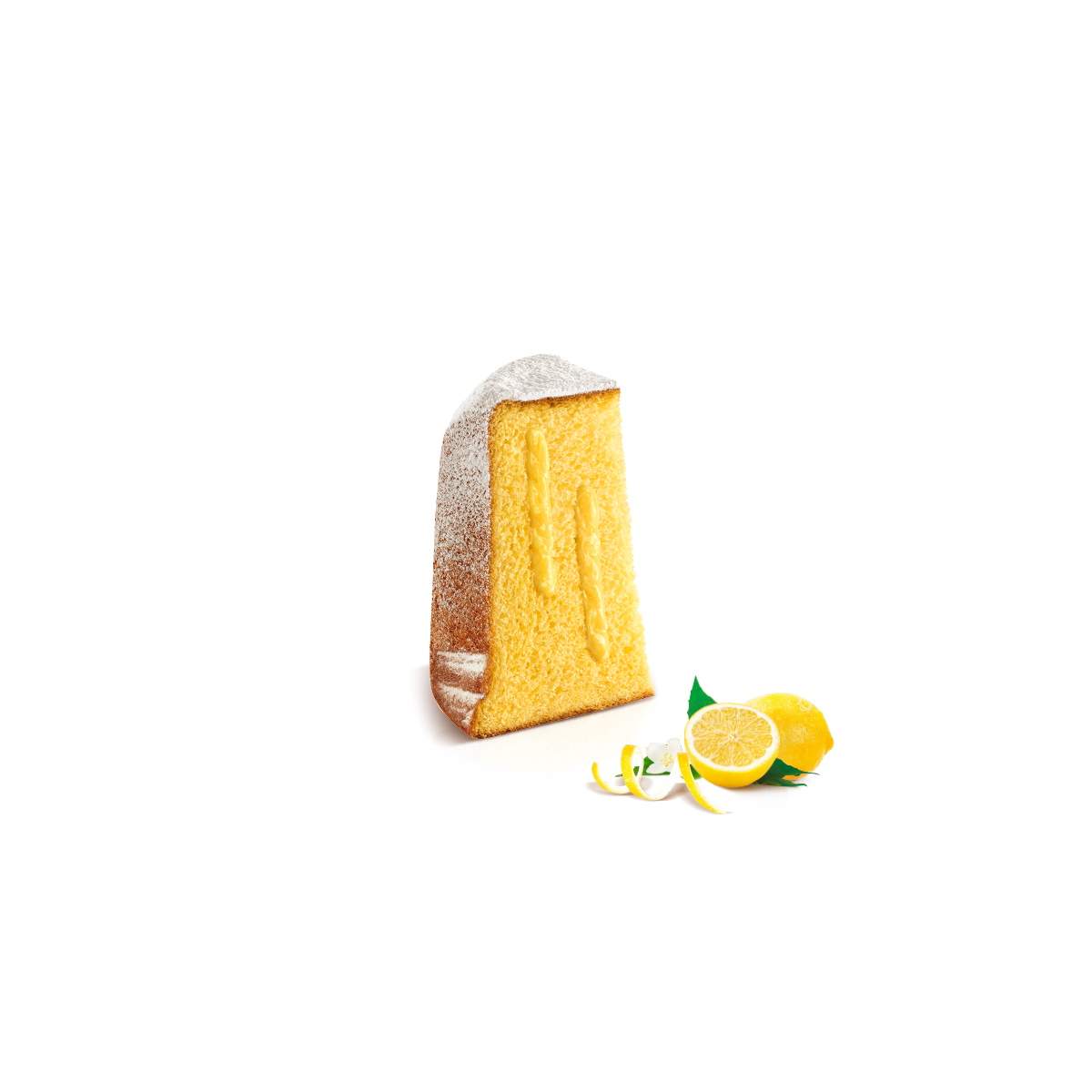 La pasta morbida e fragrante del pandoro con delicata crema al limone e spolvero di zucchero a velo.