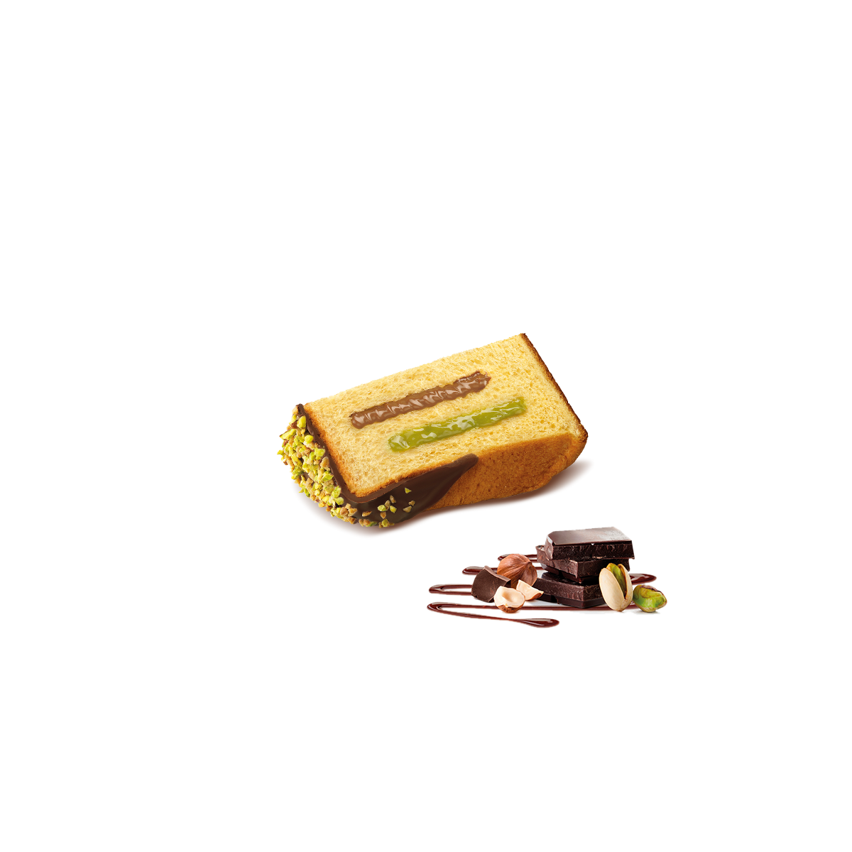 Pandoro farcito con golose creme al pistacchio e alla nocciola, ricoperto di cioccolato fondente e granella di pistacchio caramellato.