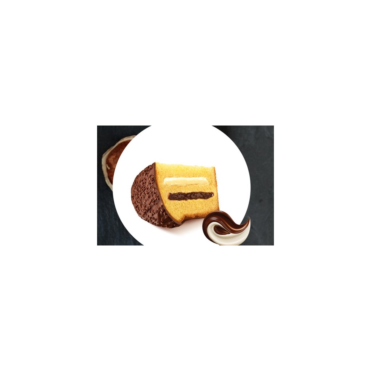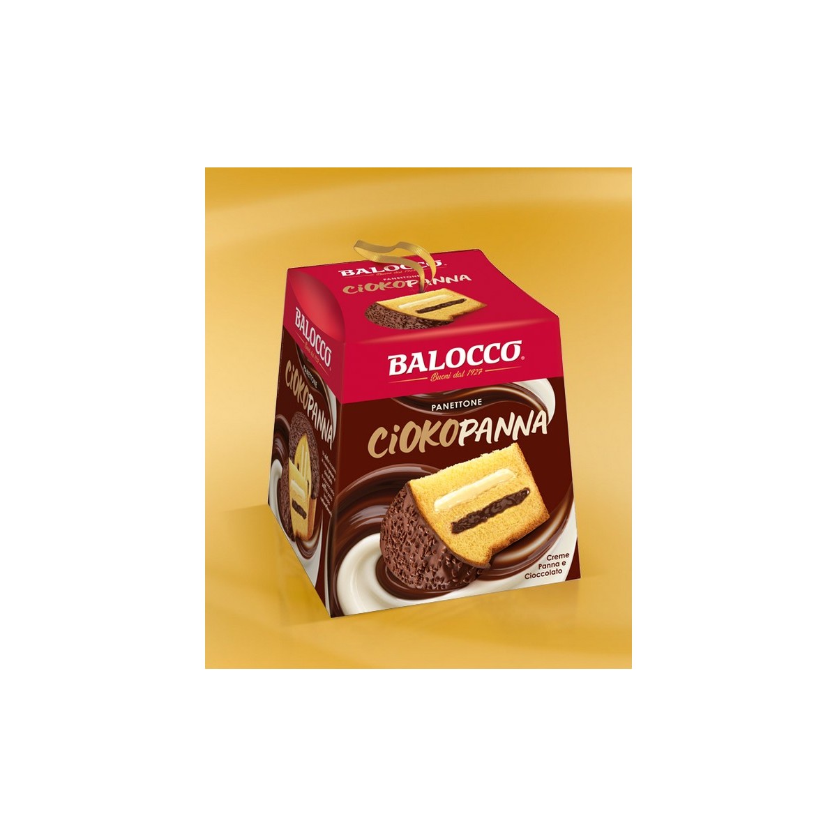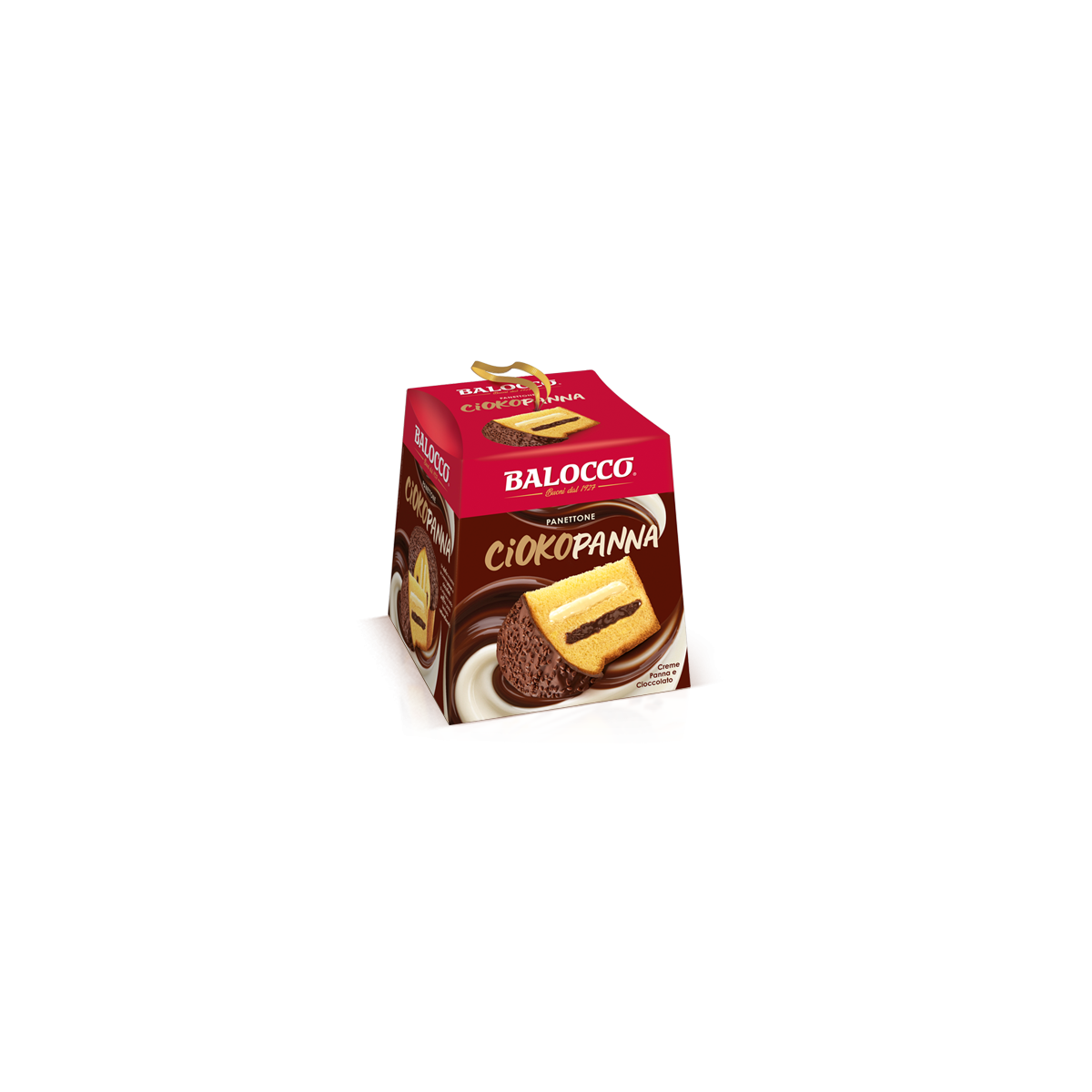 La tradizione del Panettone Balocco con farciture crema cioccolato e crema panna, con ricopertura di cioccolato e granella latte.