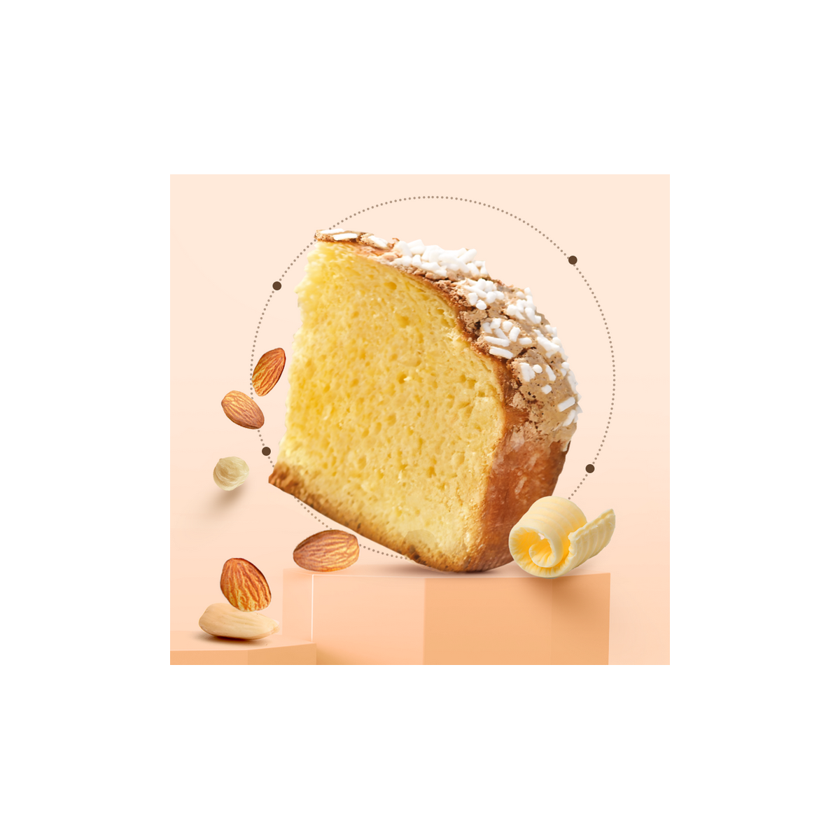INGREDIENTI: farina di grano tenero tipo “0”, zucchero, burro 13,5%, tuorlo d’uova fresche, granella di zucchero 4,5%, lievito naturale (contiene grano), albume d’uova fresche, latte intero fresco pastorizzato, mandorle, nocciole, emulsionanti: mono- e digliceridi degli acidi grassi; sciroppo di zucchero invertito, amido di riso, sale, farina di riso, aromi naturali.