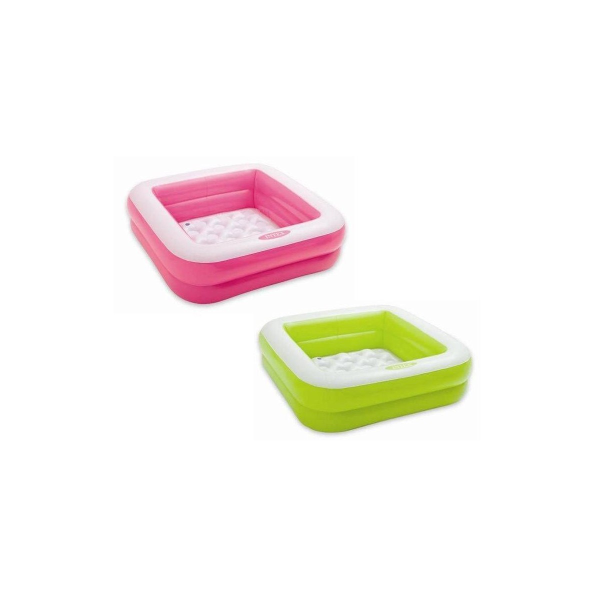 Piscina baby quadrata (85 x 85 x 23 cm) con fondo soft per maggiore comfort. Disponibile in 2 colori verde e fucsia. Capacità d'acqua 57 litri, livello suggerito di riempimento 18 cm. Età anni 1-3.