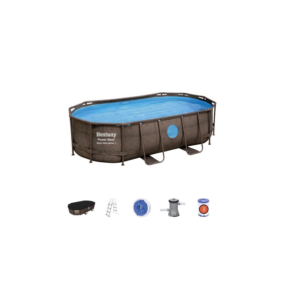 La piscina fuori terra ovale Bestway 56714 Swim Vista ad effetto vimini è realizzata con una struttura in acciaio galvanizzato di colore marrone e composta da PVC triplo strato antitaglio