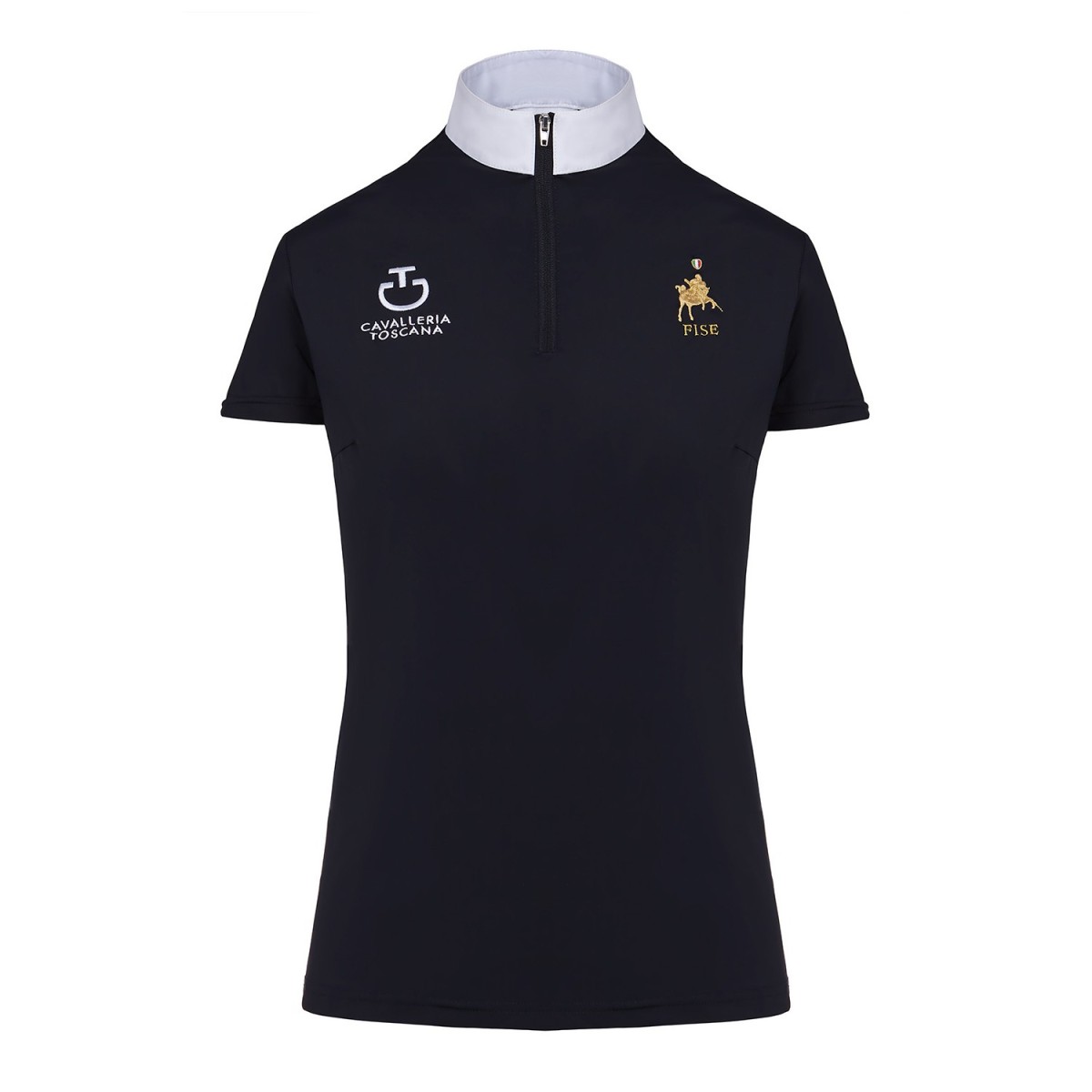 Realizzata in tessuto tecnico elasticizzato e traforato, Colletto alla coreana bianco, chiusura con bottoni e loghi Cavalleria Toscana