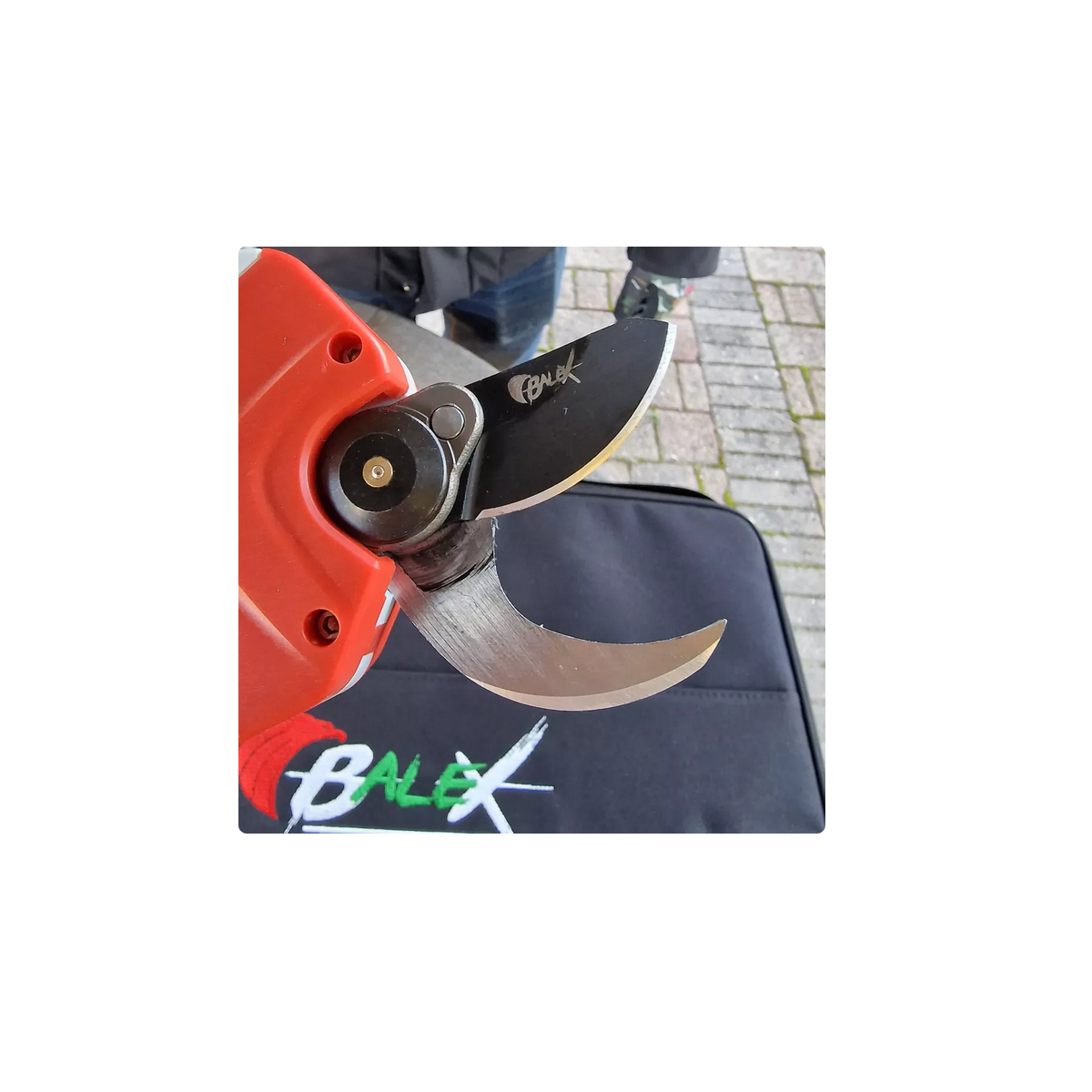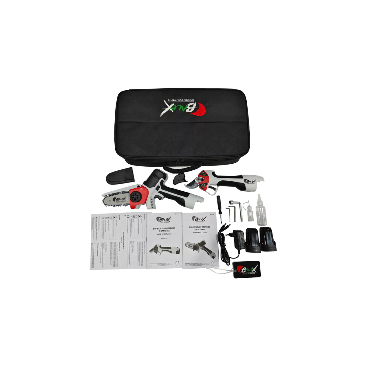 Kit pruner + forbice a batteria BALEX, composto da Pruner a batteria BALEX BXPR 1410 LI + Forbice a batteria BALEX BXFB 3014 LI. 2 batterie al litio 14.4V - 1.5Ah + caricabatterie 16.8V - 0.5A, 2 boccette per olio lubrificante in dotazione in pratica valigetta soft.