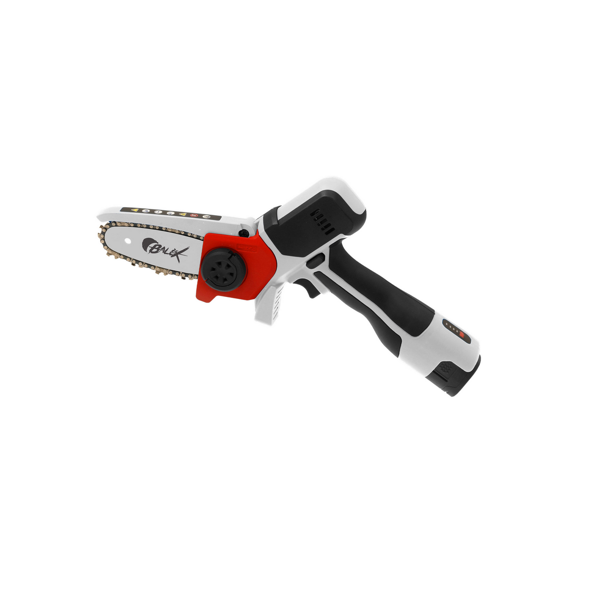 Pruner a batteria BALEX BXPR 1410 LI, motore brushless 14.4V - 1.5Ah, impugnatura ergonomica con paramano inferiore di sicurezza, barra da 10 cm, capacità di taglio 40 mm, protezione barra e catena in dotazione.