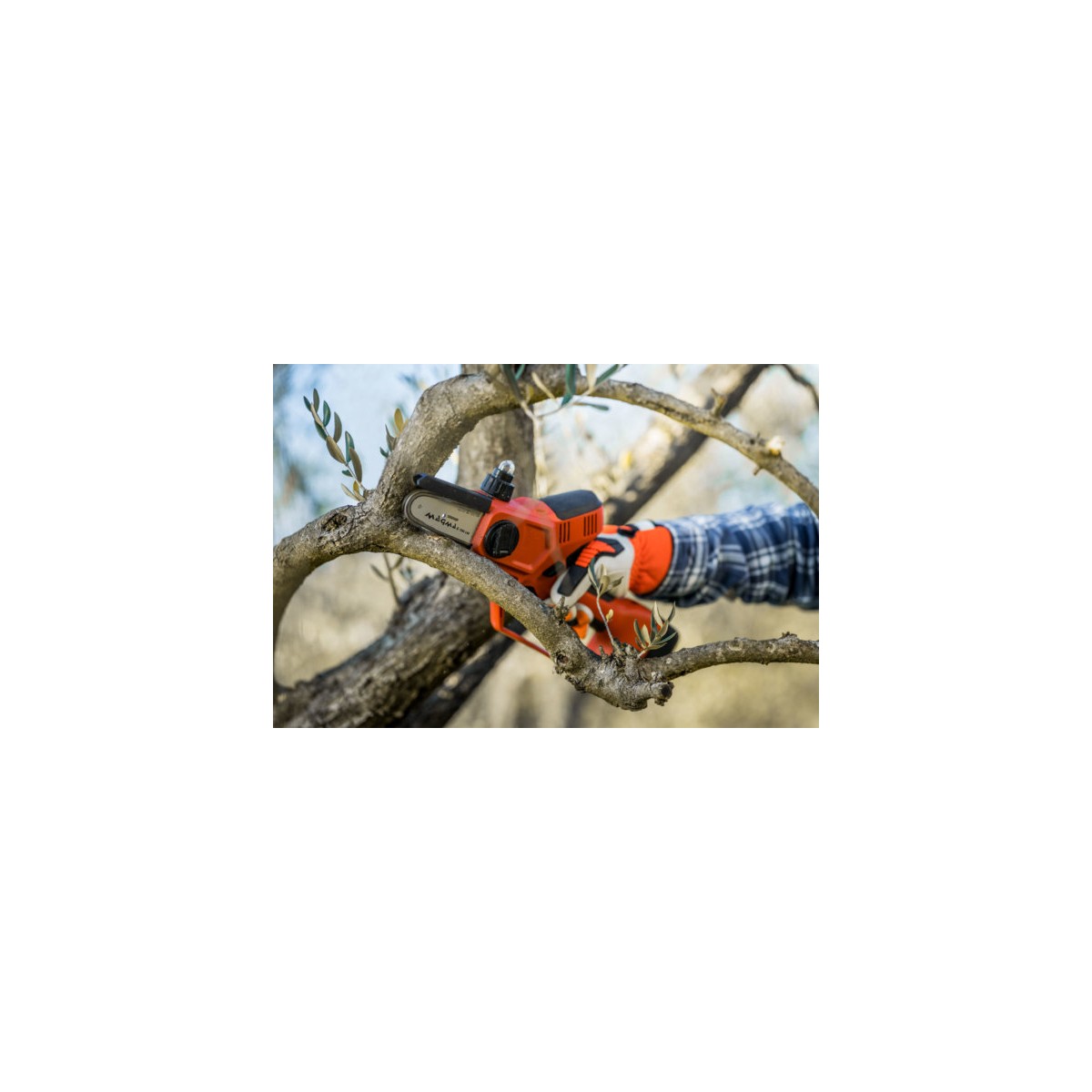 La motosega Magma E-100 LM 21 V è una pratica e funzionale motosega a batteria. La presa ergonomica ed il peso ridotto, solo 1270 gr senza batteria, riducono lo sforzo e permettono all'operatore di non affaticare la mano.