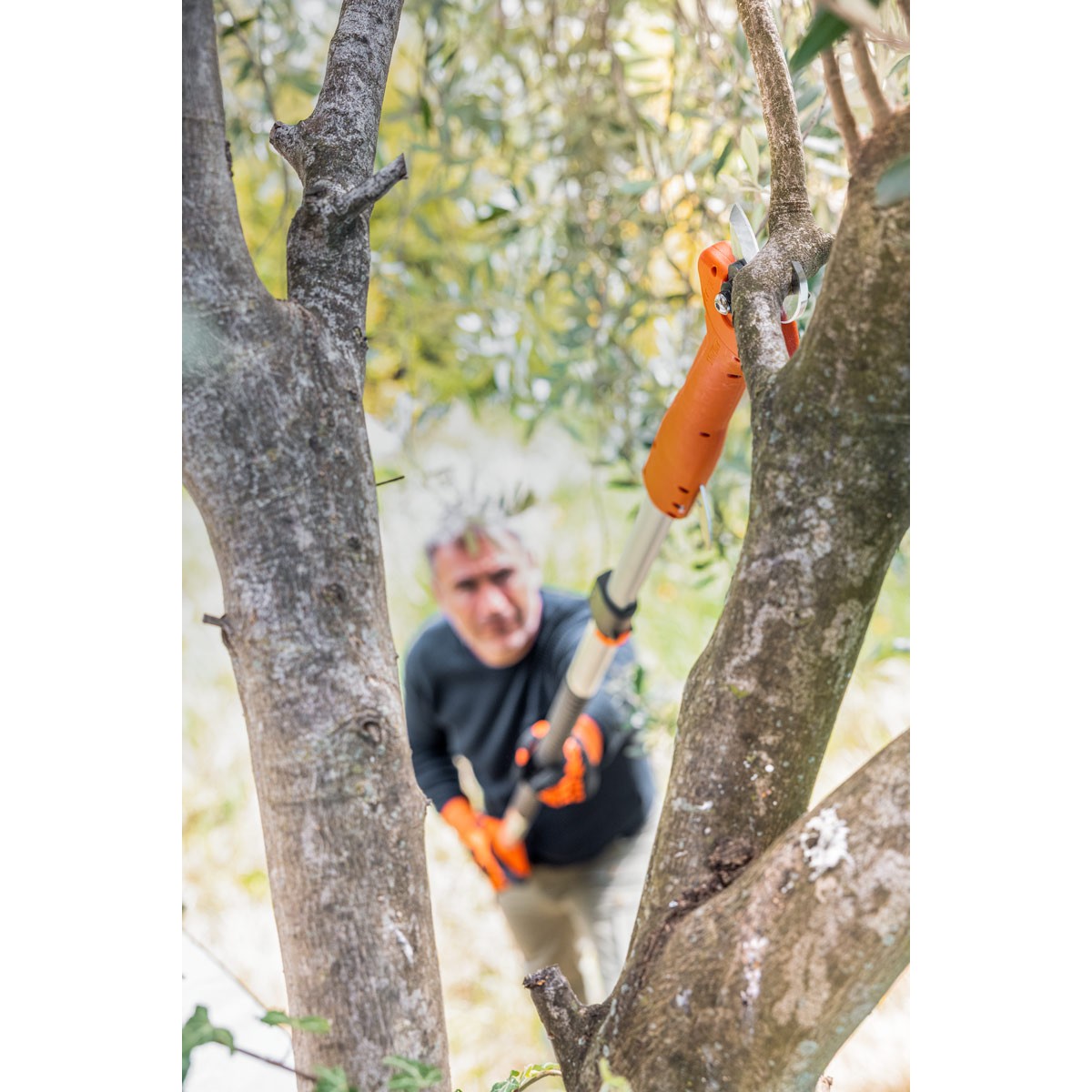 La forbice telescopica Magma E-35 TR 21 V è una novità della linea Magma 21 V e un'evoluzione del troncarami a batteria. Infatti, la lunghezza di 210-320cm e la testa snella permettono un ottimo ingresso nella pianta, per raggiungere a maggiori altezze anche i rami più interni. Il peso di 2500gr senza batteria permette di lavorare bene da terra, e di non appesantire le spalle, grazie alla maggiore lunghezza dell'asta. La batteria non è in dotazione, infatti la forbice telescopica Magma E-35 TR 21V fa parte del Magma System compatibile con la power line 21 V, ed è quindi compatibile con tutte le batterie disponibili 2,6 Ah / 21,6 V, 4 Ah/21,6V e 8 Ah/21,6V.