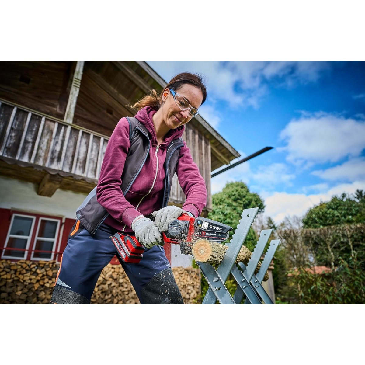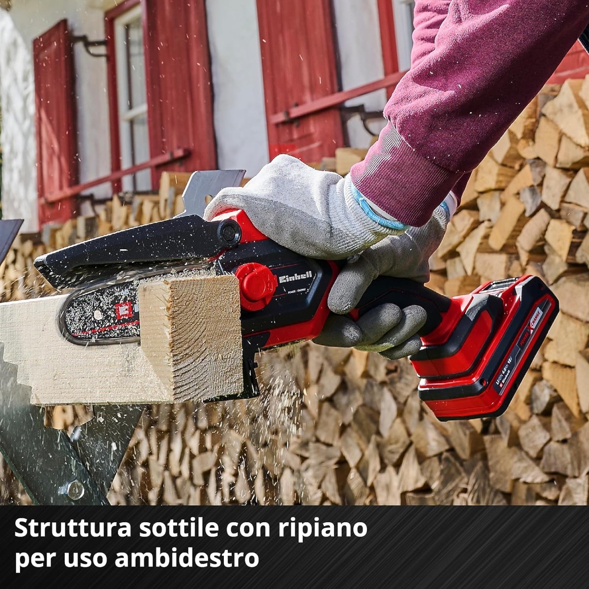 La sega a catena a batteria Einhell GE-PS 18/15 Li BL-Solo è un pratico aiuto per la potatura e il taglio di alberi e arbusti, nonché per la triturazione di potature verdi e per il taglio squadrato di legname piccolo. La sega compatta fa parte della famiglia Einhell Power X-Change e può essere combinata con tutte le batterie e i caricabatterie della stessa serie. L'apparecchio è azionato dal motore brushless Einhell PurePOWER. Il motore senza spazzole offre più potenza e una maggiore autonomia di lavoro rispetti ai tradizionali motori a spazzole a carboncino. Dopo la registrazione online, il motore è coperto da una garanzia di 10 anni. Con una lunghezza della lama di 15,8 cm e una lunghezza di taglio di 12,5 cm, questa piccola e leggera motosega a batteria è ideale per un uso versatile in giardino. Il motore ad alta efficienza garantisce vibrazioni minime e una velocità della catena fino a 4,8 m/s. La sega viene fornita con un set di lame e catene di alta qualità per elevate prestazioni di taglio e i migliori risultati di lavoro. Per una facile manutenzione, la barra e la catena possono essere sostituite facilmente e senza attrezzi. La sega è dotata di una protezione per le mani e di un copricatena pieghevole che ne rendono l'uso sicuro e versatile. Il pratico attrezzo da giardino è comodo da tenere in mano grazie all'impugnatura sottile, alle speciali superfici Softgrip e al poggiamani incorporato per l'uso ambidestro. Consegnata con copertura per riporre in modo sicuro la piccola motosega. Sono inclusi anche un dosatore per l'oliatura manuale della catena e una chiave a brugola per il tensionamento della catena. Entrambi sono riposti nell'apparecchio stesso e quindi sono sempre a portata di mano. La fornitura si intende senza batteria e senza caricabatteria, che devono essere acquistati separatamente, per esempio con il pratico Starter Set.
