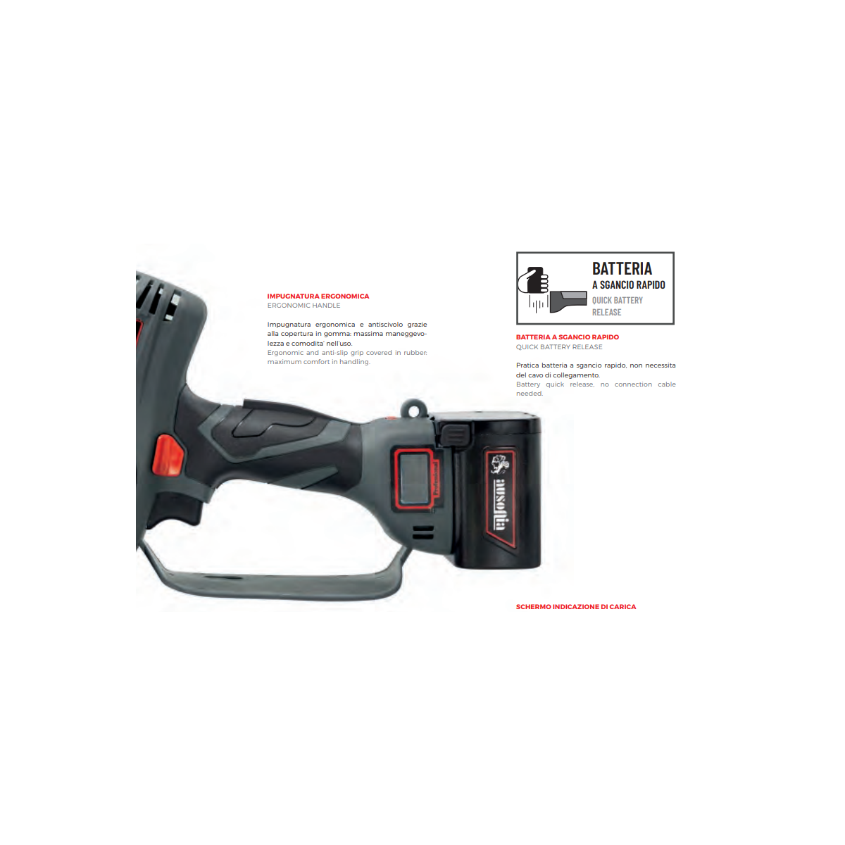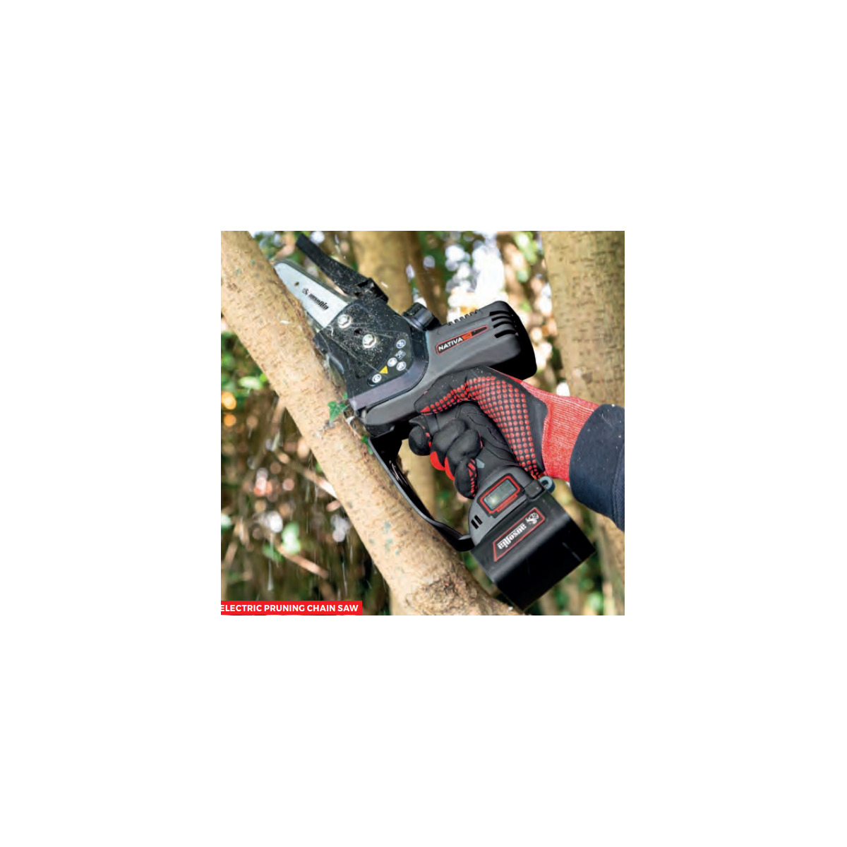 NATIVA SAW, FORNITO CON 3 BATTERIE E 1 CARICA BATTERIE+CATENA DI RICAMBIO Versatile potatore a batteria per la potatura di piccoli alberi e cespugli, per ridurre a piccoli pezzi il materiale tagliato e per lavori di carpenteria. Con catena da 1/4“ per alte prestazioni e tagli potenti. Impugnatura antiscivolo per un’ergonomia perfetta e 3 bottoni di sicurezza per un utilizo sicuro della sega. Copertura di protezione fl essibile per lavorare in sicurezza, con indicatore dello stato di carica e contatore.