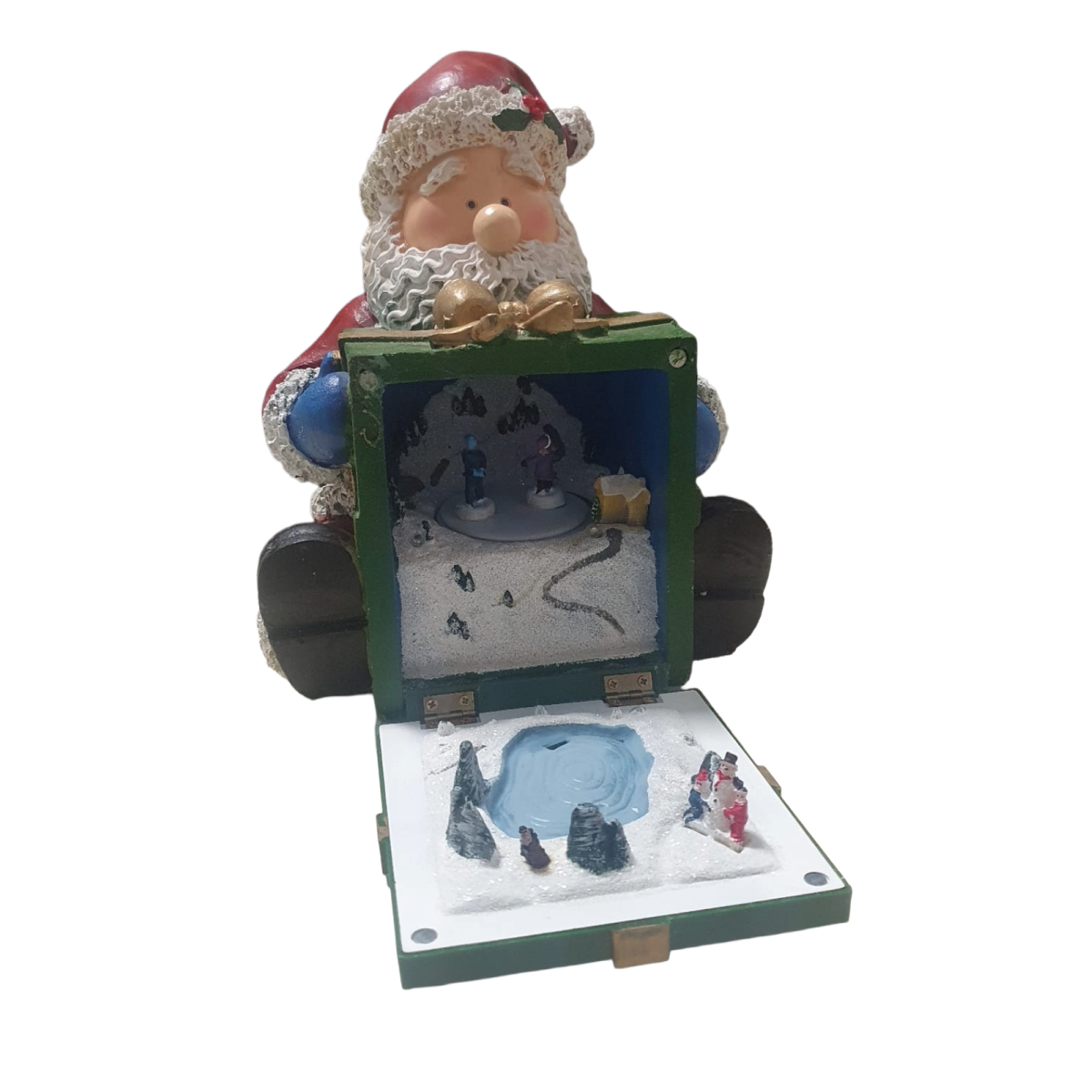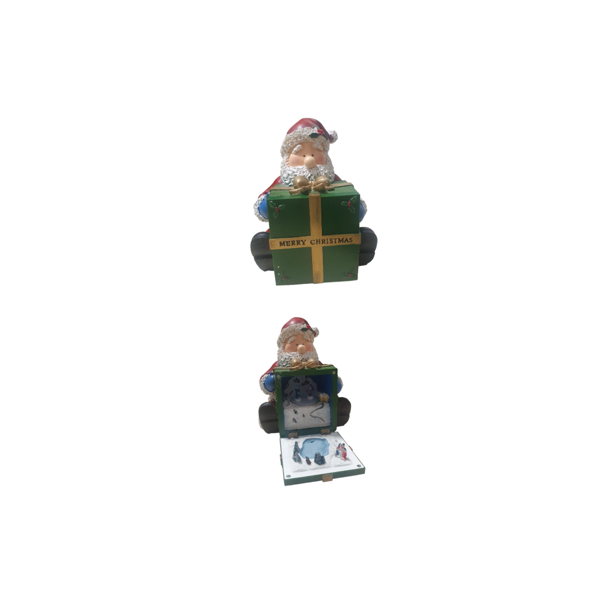 Giostrina con Babbo Natale e pacco regalo che si apre. Con luci, movimenti e musica.