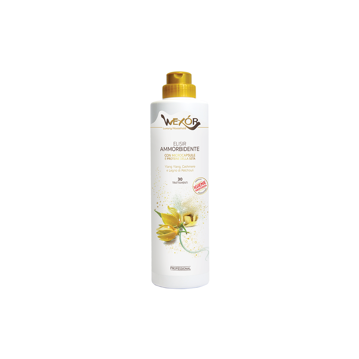 Elisir Ammorbidente Giallo Cashmere Wexór ha un formula professionale arricchita con microcapsule e proteine della seta. Grazie a materie prime ricercatissime ed a una fragranza intensa e raffinata, il bucato risulterà vaporoso e profumato. Le speciali proteine della seta presenti nei formulati Wexór coccolano, curano e nutrono le fibre. L’inebriante persistenza della nota profumata ne completa il trattamento di bellezza.