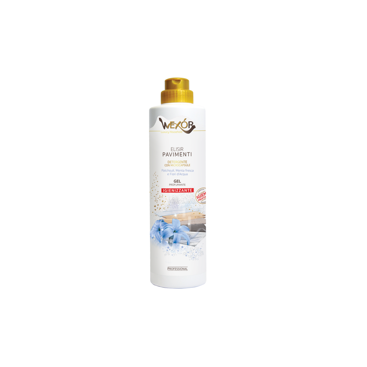 Elisir Pavimenti Fiori d’acqua Wexór è un detergente igienizzante per pavimenti, un vero e proprio trattamento di igiene e bellezza per tutti i tipi di pavimenti e superfici lavabili. La sua formula GEL concentrata garantisce un risultato perfetto già dal primo utilizzo. Le microcapsule contenute favoriscono un “lento rilascio” e consentono alla preziosa profumazione di persistere per molto tempo dopo il lavaggio. Riduce i tempi di pulizia e non richiede risciacquo.