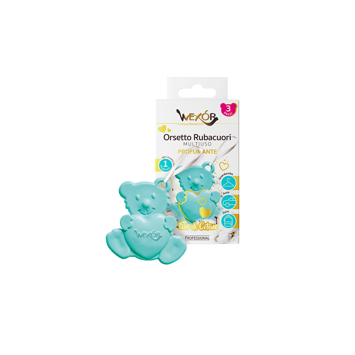 - Guardaroba: Posiziona l’Orsetto Rubacuori nei cassetti o appendilo nell’armadio utilizzando il comodo laccetto. La sua fragranza avvolgerà i tuoi capi, donando un’irresistibile ventata di freschezza.