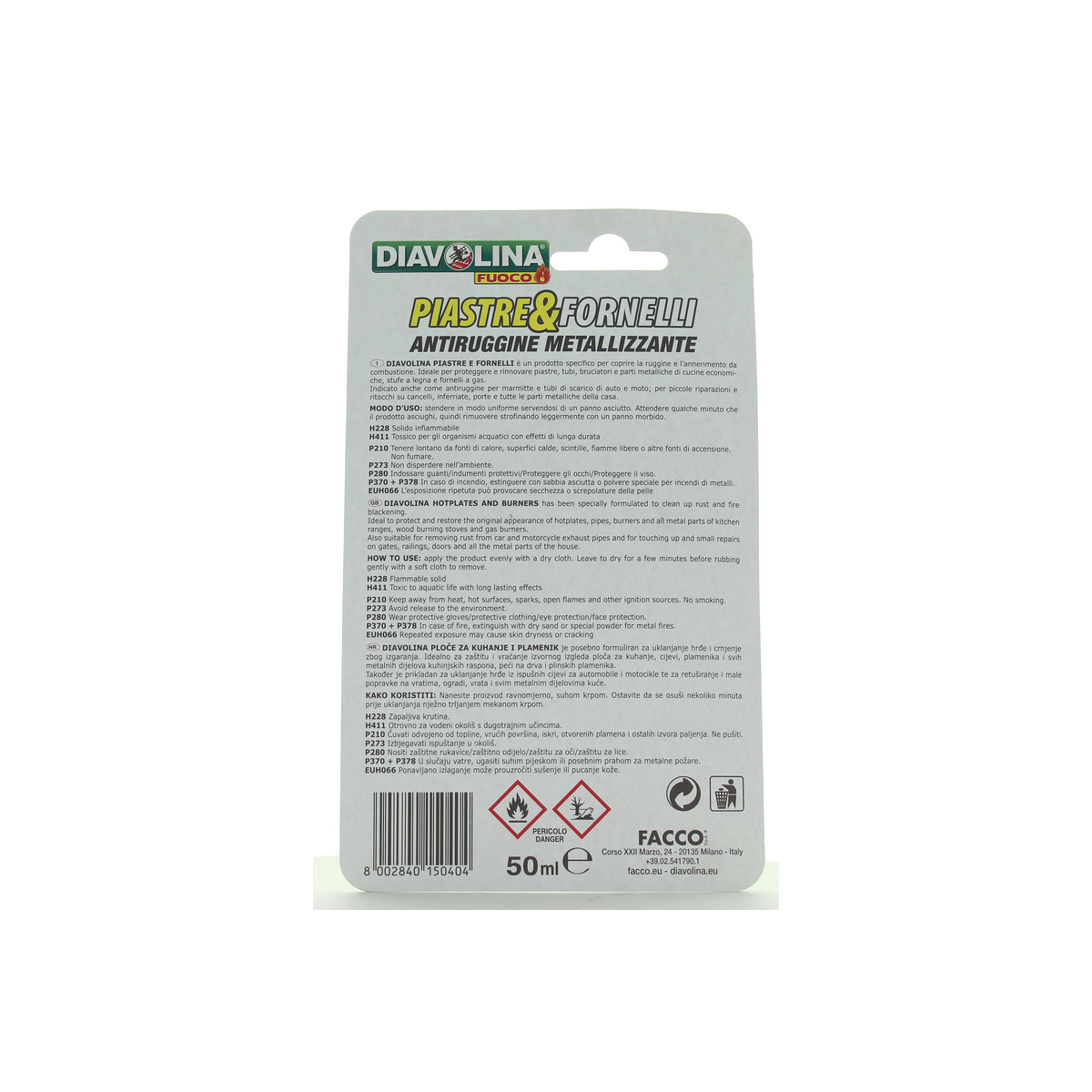 - Diavolina Piastre e Fornelli è la pasta antiruggine metalizzante specifica per pulire e lucidare piastre, cucine economiche, fornelli a gas e tubature di stufe.