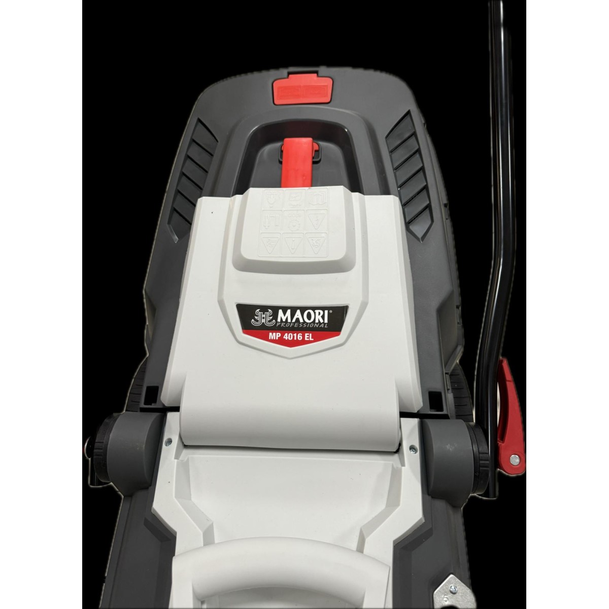 Rasaerba MAORI "Electro Line" MP 4016 EL. Manico ergonomico regolabile e interamente ripieghevole per un facile rimessaggio. Cesto rigido in plastica facilmente svuotabile, con indicatore cesto pieno. Telaio in polypropilene a doppio guscio, ultra leggero e di facile manutenzione. Ruote Hight Wheeler. Altezza di taglio facilmente regolabile in 5 posizioni tramite leva centralizzata. Interruttore elettrico a leva ergonomica passante. Motore elettrico silenzioso, ecologico e privo di manutenzione