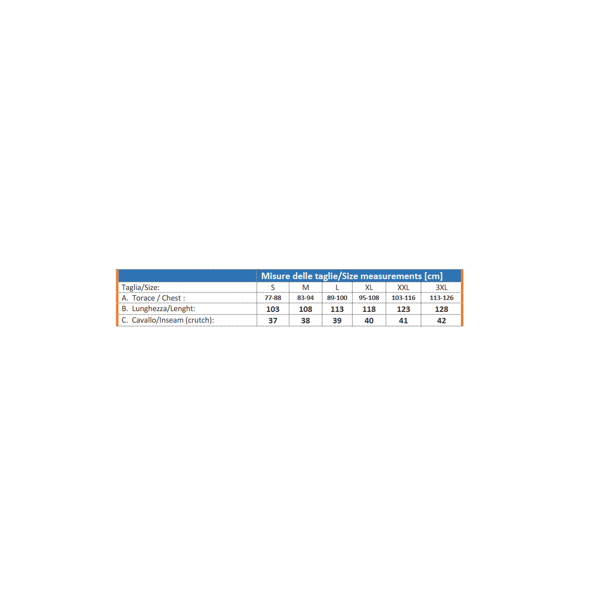 Tuta bicolor con due tasche frontali ad altezza torace, un tascone laterale, una tasca posteriore, due tasche in vita e due tasche passanti (utili nel caso si utilizzi il capo sopra un altro pantalone). Elastico in vita per un maggior comfort ed elastico removibile ai polsi.