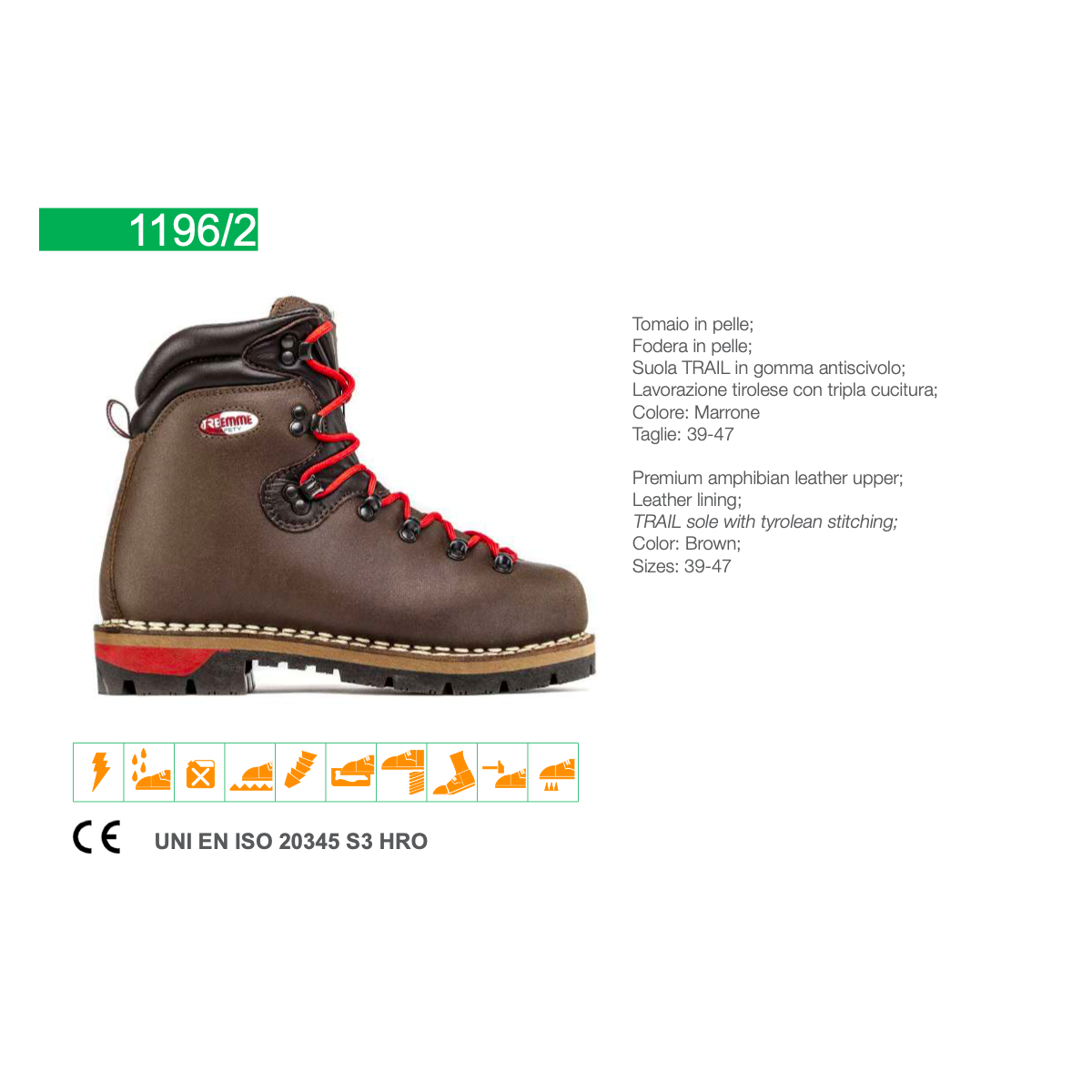 Tomaio in pelle anfibio;Fodera in pelle;Suola TRAIL in gomma antiscivolo;Lavorazione tirolese con tripla cucitura.
