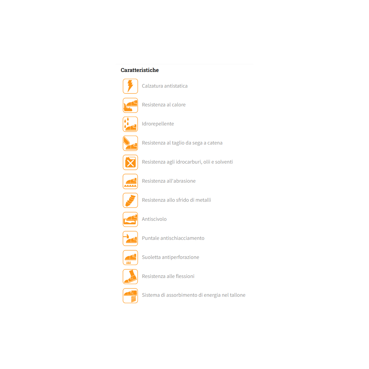 Calzatura antistatica Resistenza al calore Idrorepellente Resistenza al taglio da sega a catena Resistenza agli idrocarburi, olii e solventi Resistenza all'abrasione Resistenza allo sfrido di metalli Antiscivolo Puntale antischiacciamento Suoletta antiperforazione Resistenza alle flessioni Sistema di assorbimento di energia nel tallone