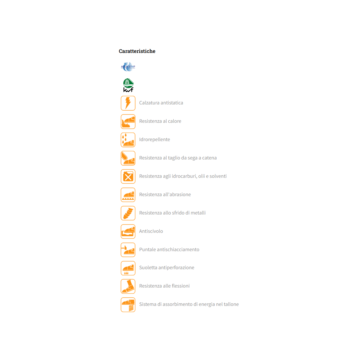 Calzatura antistatica Resistenza al calore Idrorepellente Resistenza al taglio da sega a catena Resistenza agli idrocarburi, olii e solventi Resistenza all'abrasione Resistenza allo sfrido di metalli Antiscivolo Puntale antischiacciamento Suoletta antiperforazione Resistenza alle flessioni Sistema di assorbimento di energia nel tallone