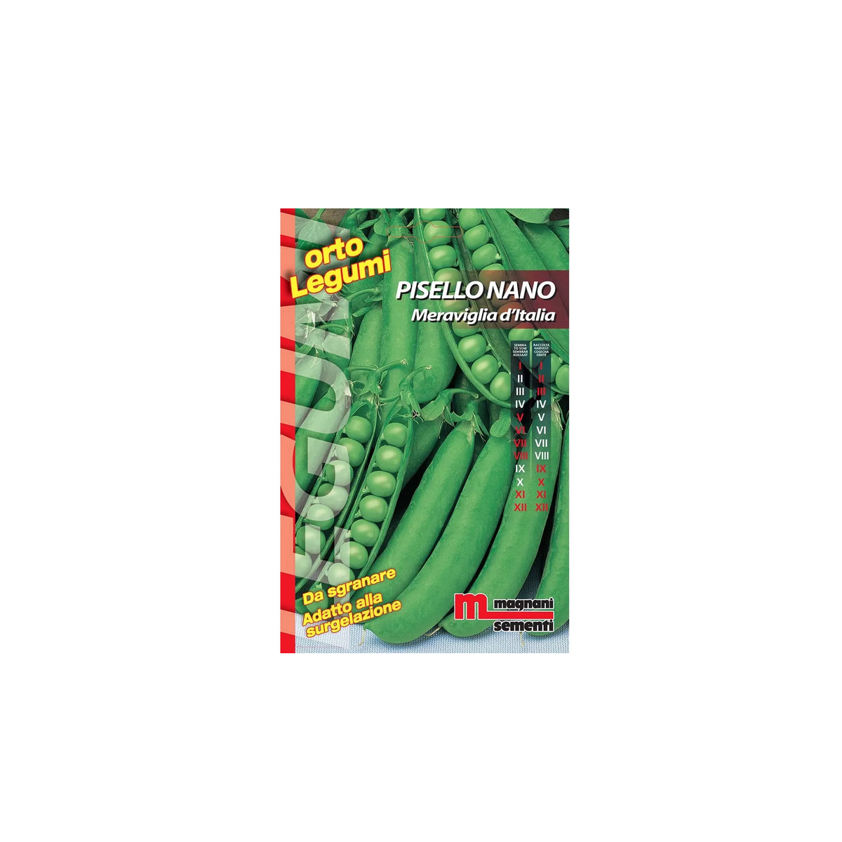 Pisello nano meraviglia d` Italia produce baccelli diritti di colore verde medio della lunghezza di 10-11 cm da 8-9 grani. La pianta raggiunge un`altezza di 40-50 cm, il suo ciclo vegetativo dura 70-80 giorni per le semine primaverili, 170-180 giorni per le semine autunnali.