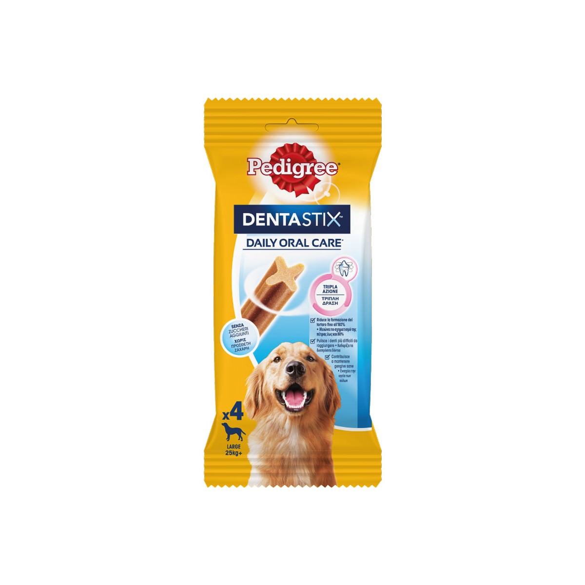 Pedigree Dentastix è adatto ad un trattamento giornaliero di igiene orale e aiuta a prevenire problemi dentali come paradontiti, infiammazioni e alitosi. Questo snack masticabile è adatto a cani di peso superiore a 25 Kg. Non adatto a cuccioli di età inferiore a 4 mesi.