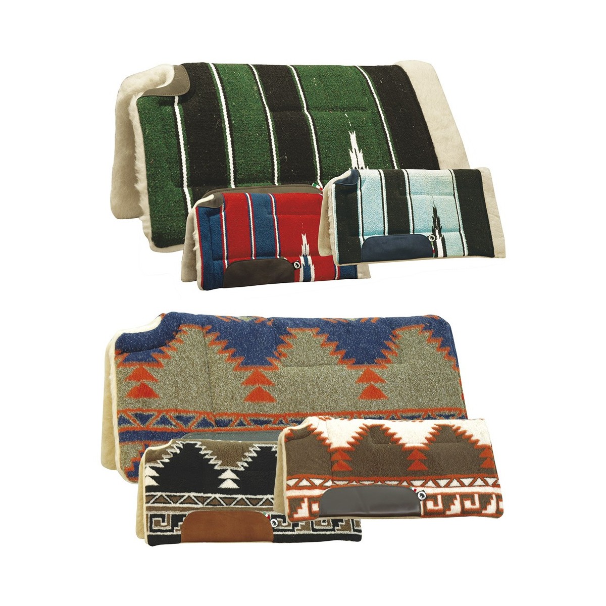 Sottosella western imbottito, tessuto navajo e pelliccietta in pura lana, rinforzi in pelle, garrese aperto. Colori assortiti.