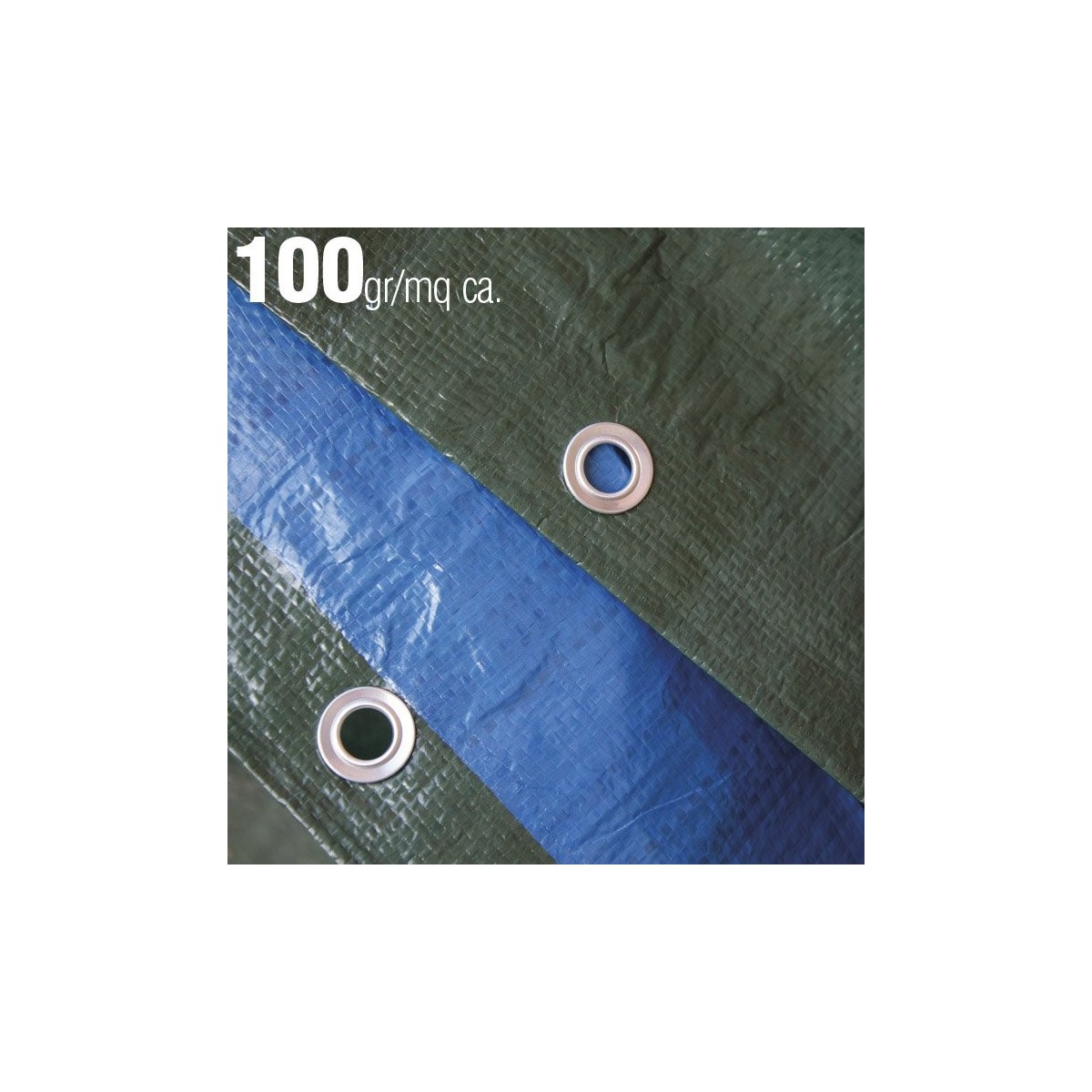 Telo occhiellato multiuso in polietilene, blu - verde, 100 gr/mq, robusto ed impermeabile, è adatto per coperture, stoccaggio, edilizia ecc. Bordo rinforzato, occhielli in alluminio.