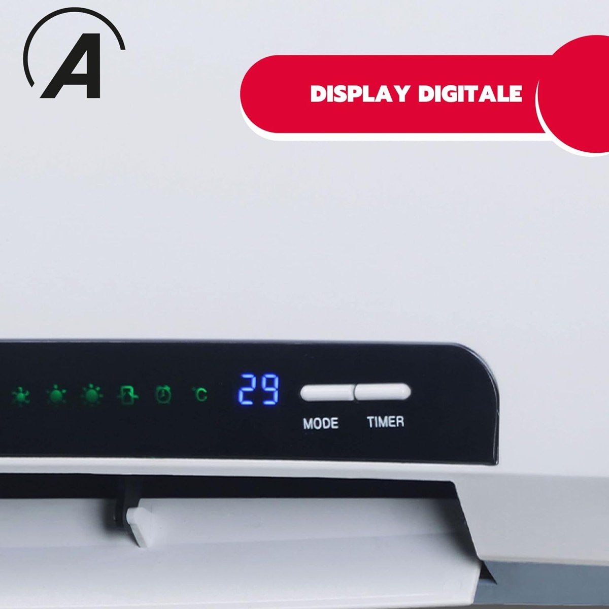 - SMART | Con il display LED puoi vedere la temperatura dell'aria nella stanza, modificabile con il telecomando: puoi impostare il timer 12 ore, la programmazione settimanale e i livelli di potenza eco e comfort. Dotato pure di rilevamento finestre aperte: se la temperatura scende di 5-10°, si attiva l'arresto automatico per andare in basso consumo.