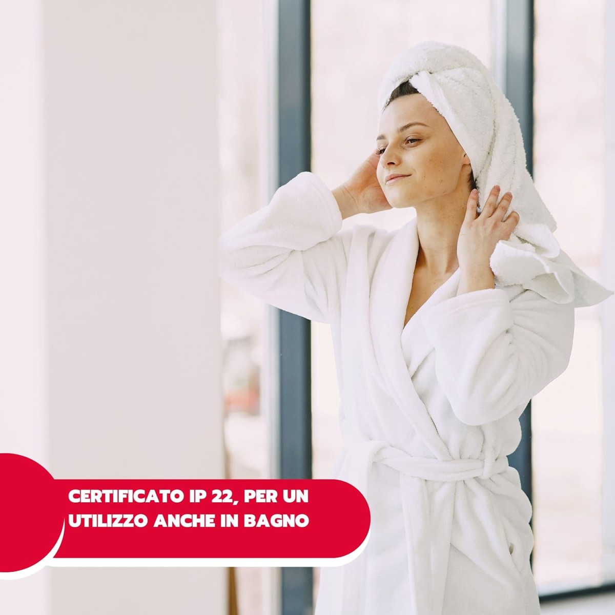Termoventilatore ceramico. 2 livelli di potenza: eco e comfort. Ventilazione estiva. Telecomando. Timer 12 ore per accensione o spegnimento. Programmazione settimanale. Ceramico: sicuro ed efficiente. Display LED con indicazione della temperatura. Ideale per l’utilizzo in bagno, protetto dalla caduta di gocce dacqua sia verticali che oblique (IP22, fino a 15°). Oscillazione automatica. Sistema di protezione anti surriscaldamento.
