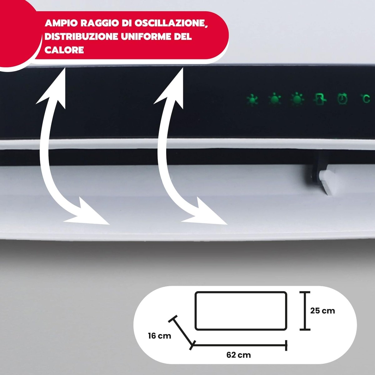 - CARATTERISTICHE TECNICHE | Dimensioni del termoventilatore a muro Ardes LxPxH: 62cm x 16cm x 25cm. Il termoventilatore è WATERPROOF con certificazione IP22, dunque ideale per l’utilizzo in bagno poiché protetto dalla caduta di gocce d’acqua sia verticali che oblique (fino a 15°). E anche sicuro, grazie alla protezione anti surriscaldamento.
