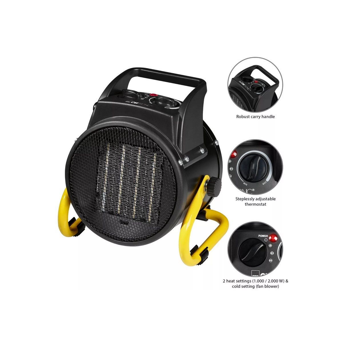 • 2 selezioni temperatura: 1000-2000 watt